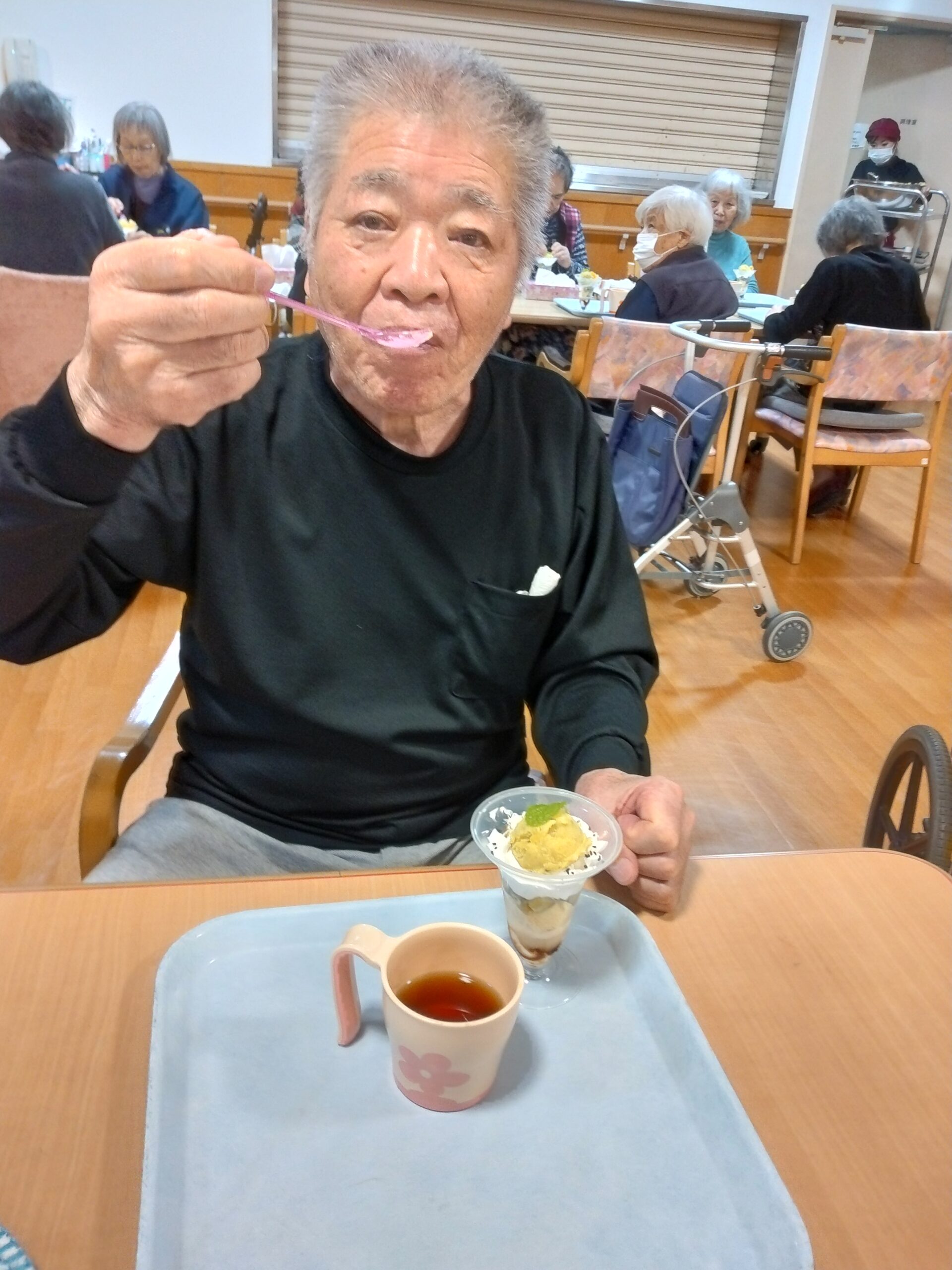 おやつに、栄養課さん協力の元「サツマイモパフェ」を作りました。 黒蜜のアクセントがとても甘くて美味しいと皆さんニコニコでした😀 今月は、紅葉ドライブや旬の食べ物を頂き秋を満喫しました(^^)/