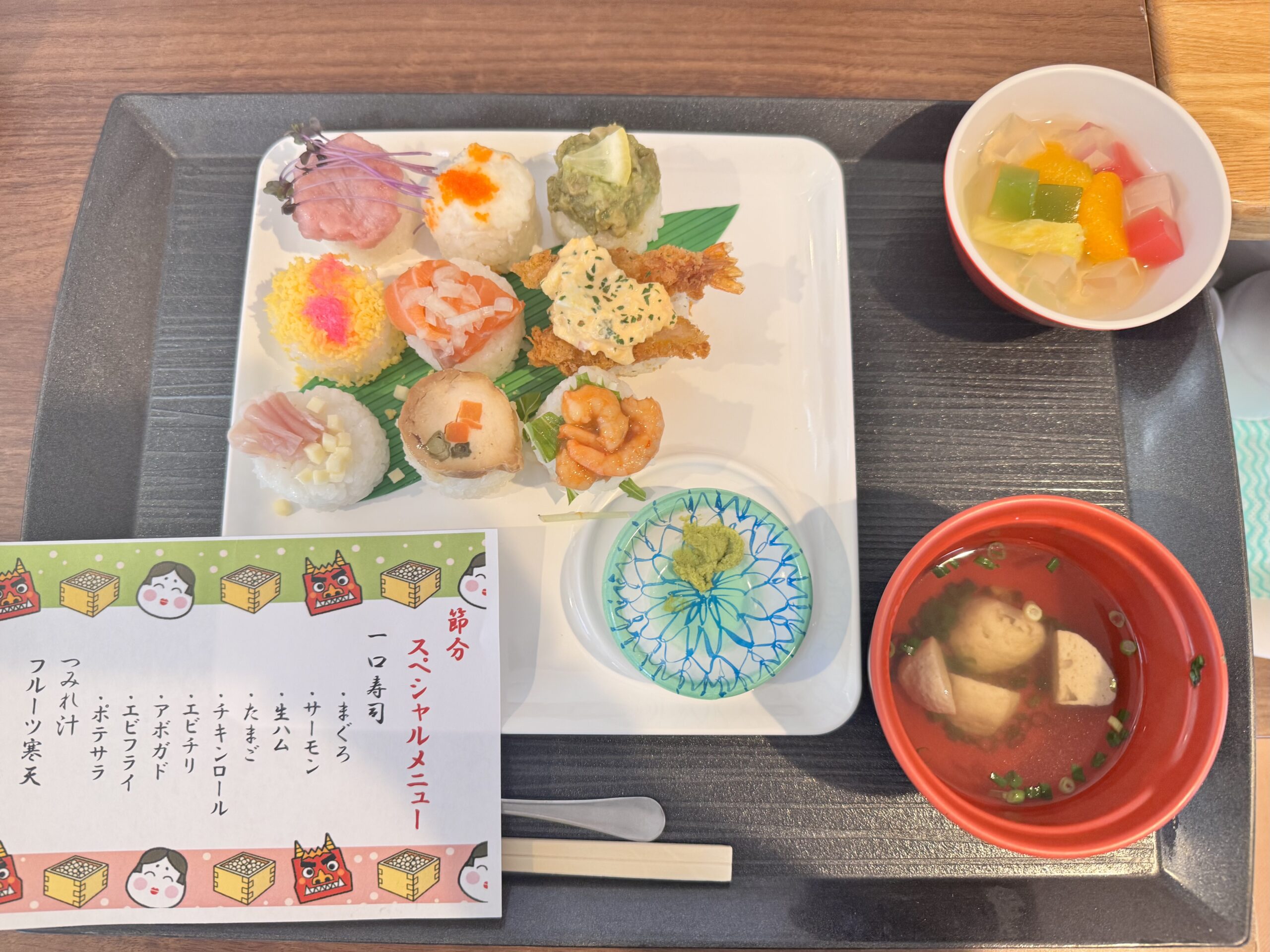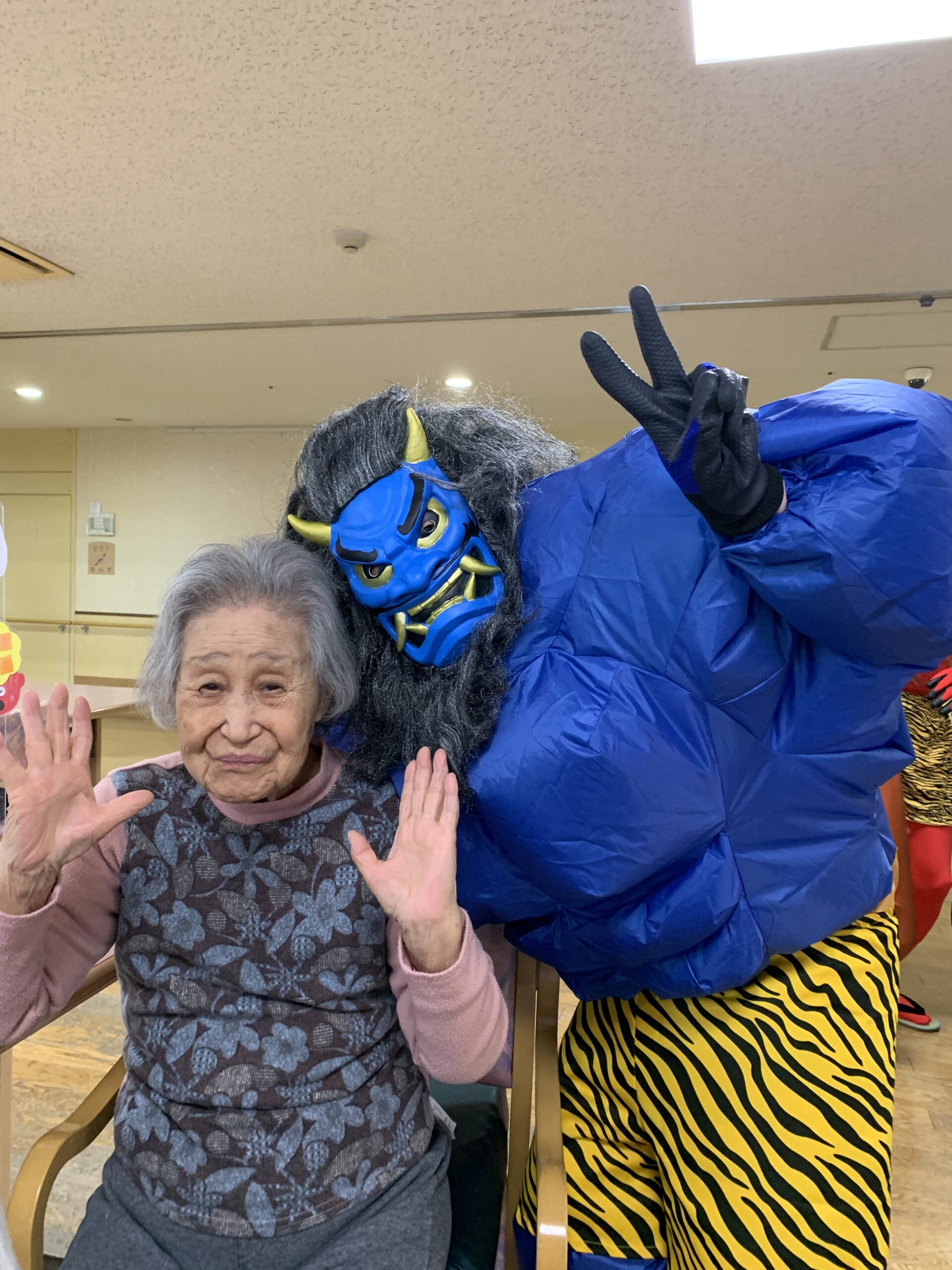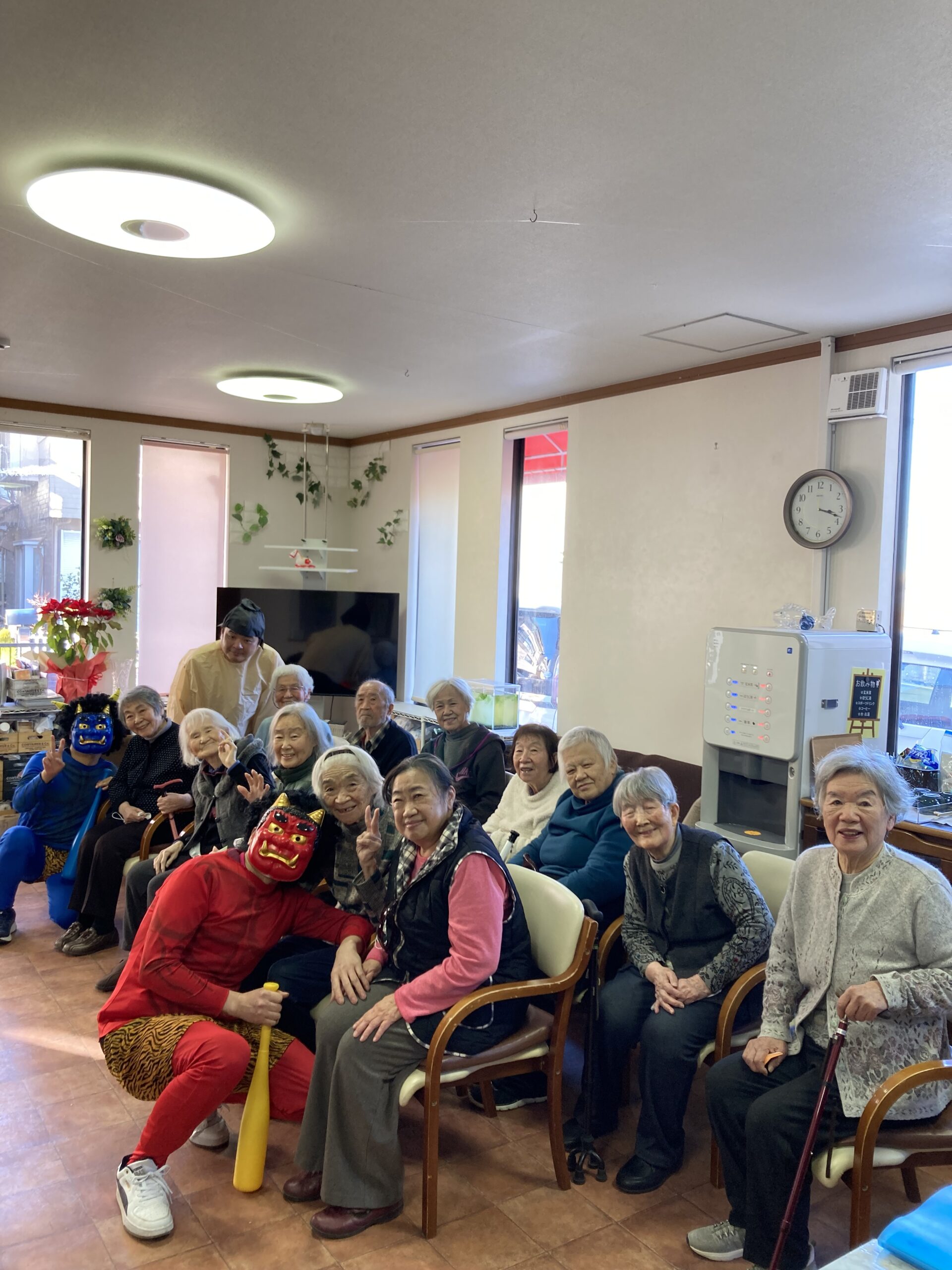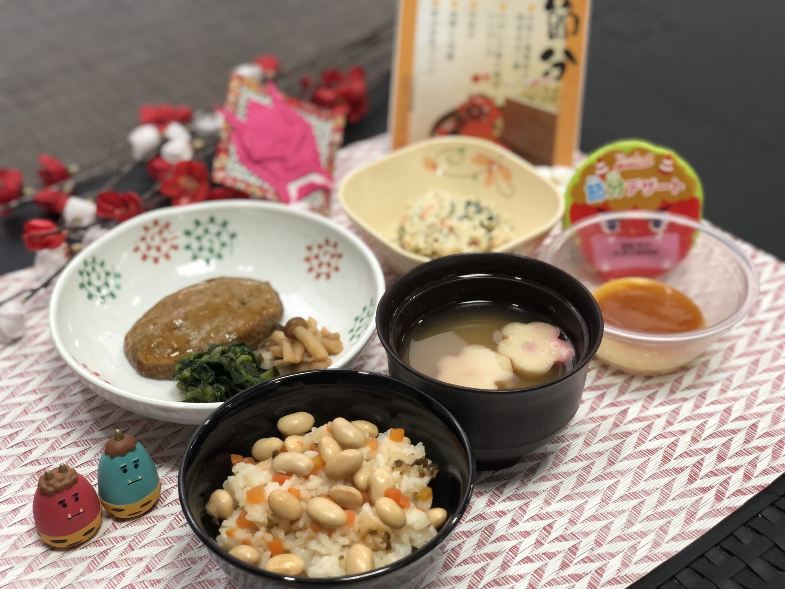 2月3日節分です。 赤鬼、青鬼登場。 「鬼は外福は内!!」と大きな声で言いながら豆を力一杯投げました。 鬼も降参し退場に万歳〜!! 今年も元気に過ごせそうです。 昼食は節分メニュー。かわいいお寿司に「わぁー美味しそう!」 […]