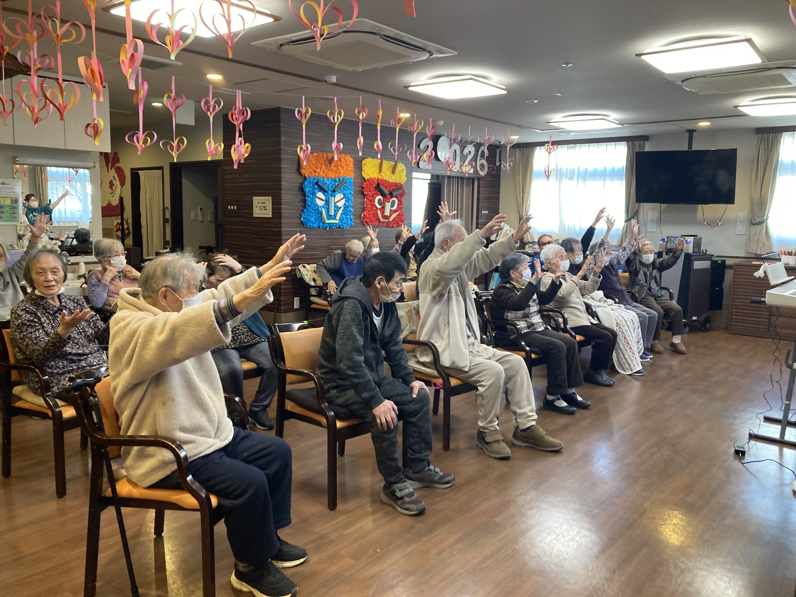 日差しが差し込み室内は暖かい1日となりましたね。本日も体操で始まり、午後からは音楽🎵アクティビティ、春の飾り物の制作と月初の体重測定と、あっという間の1日となりました。✨😊✨