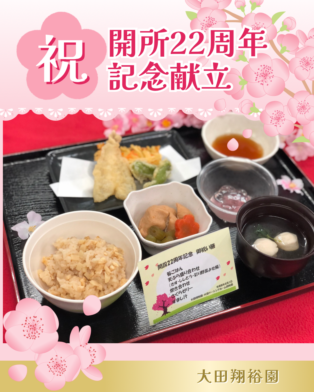 令和8年4月1日で大田翔裕園は開所22周年を迎えました。日頃より施設運営にご理解・ご協力いただきありがとうございます。 本日の昼食に皆様に感謝とお祝いの気持ちを込めてお祝い膳を提供しました。 ~お品書き~ 〇筍ごはん 〇 […]