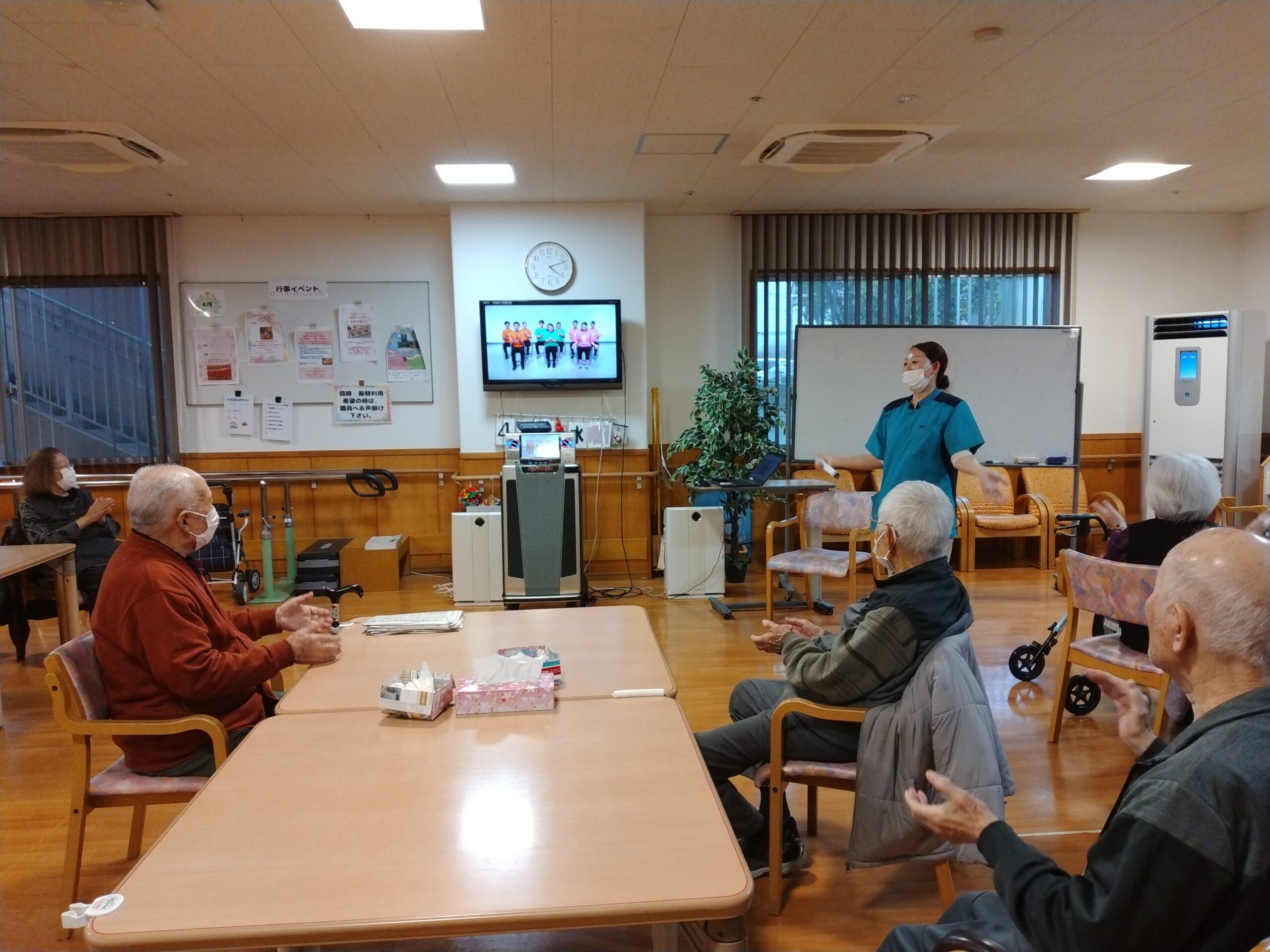 本日、デイサービスではテレビの映像に合わせて、楽しくリズム体操を行いました(^^)/ 普段、職員の掛け声に合わせた体操も良いですが、テレビから流れる音楽や体操も 一味違いますね(*^^)v