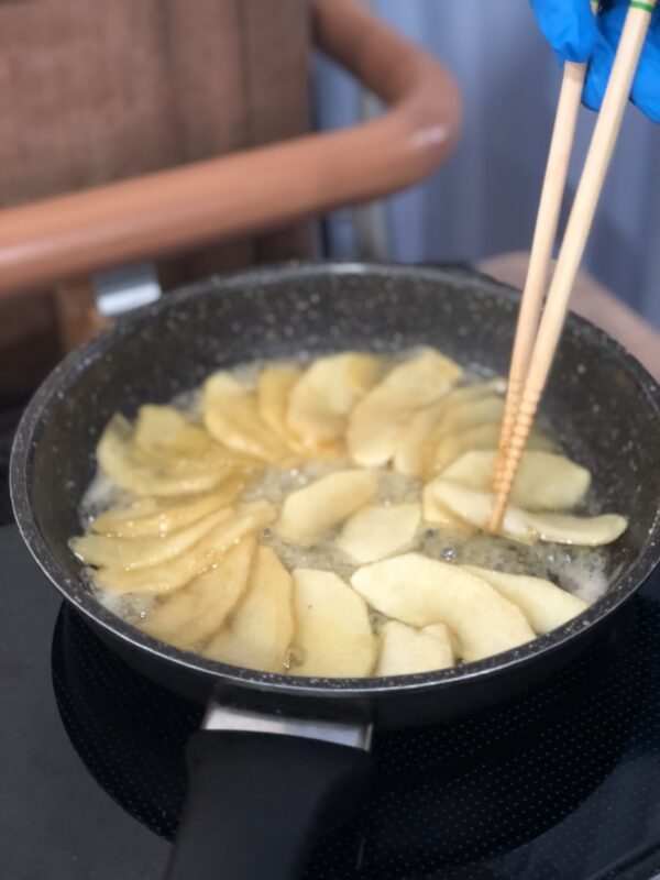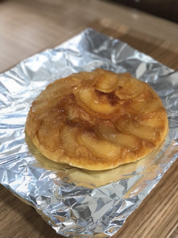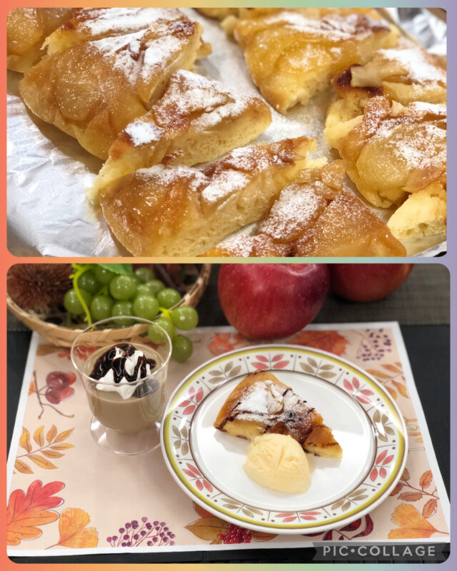りんごケーキは、りんごをフライパンでキャラメリゼしてから生地を流して焼いていきます🍎こんがり焼き目をつけて見た目にも美味しそうに焼きあがりました😋