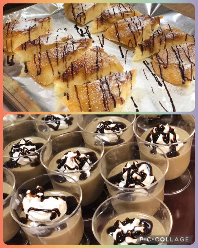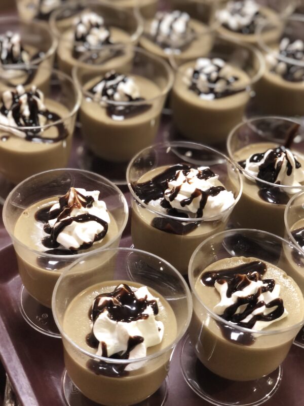 ほうじ茶プリンはチョコレートソースをかけて提供しました。