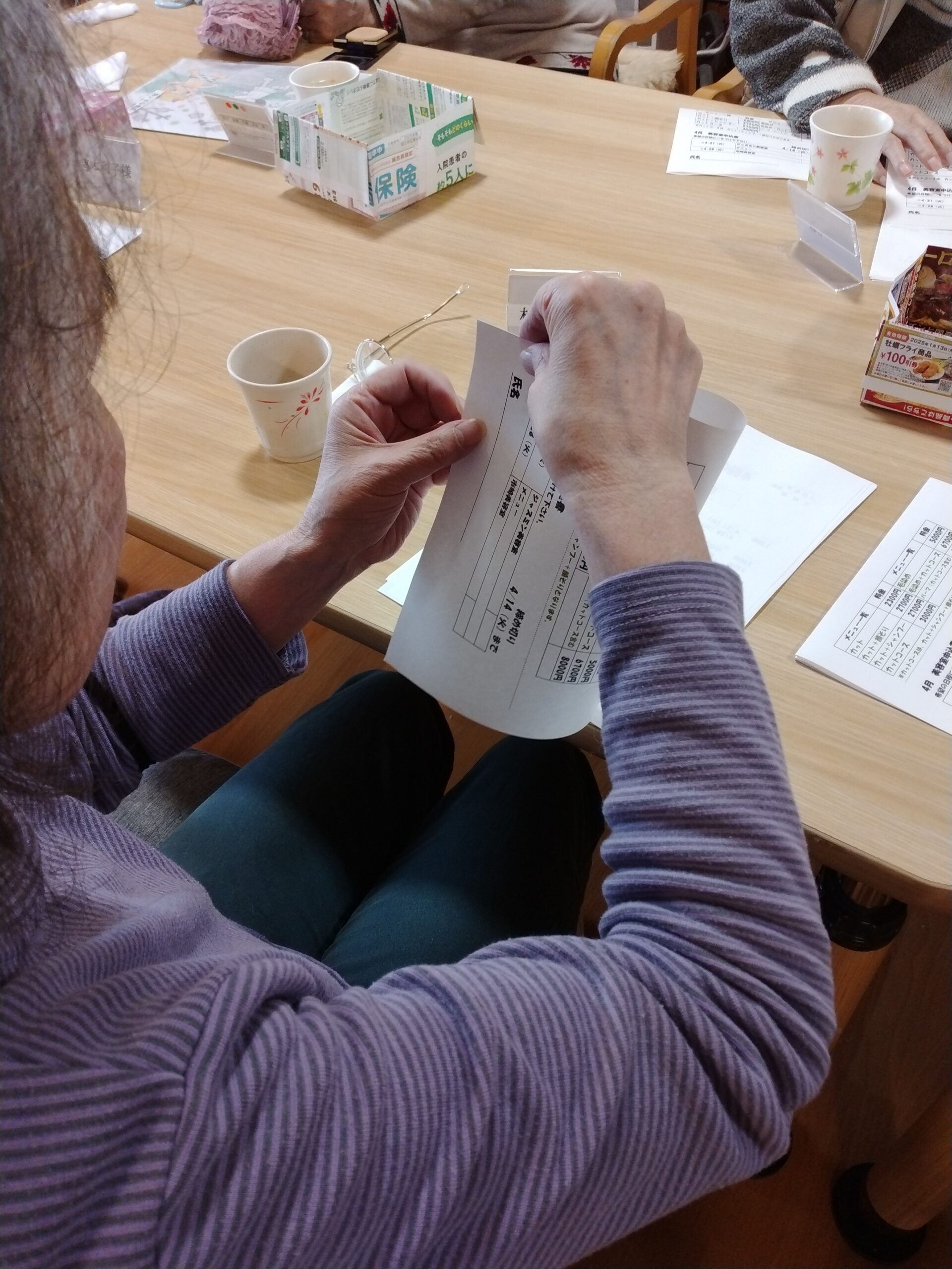 本日、デイサービスでは利用者様が100枚近くある用紙を半分に折る作業を お手伝いしてくれました(^^)/ 用紙の角と角をピッタリ合わせて綺麗に折って頂きました。 終わると達成感があり、笑顔になりました(*’▽ […]