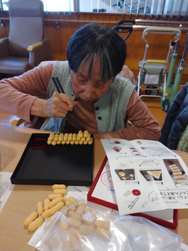 ビーナッツの形のものを箸でつまみ、積み上げたり、並べたりするゲームです😀
