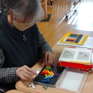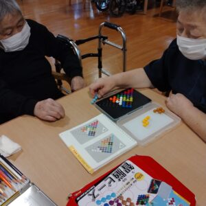 デイサービスでは恒例ですが、色と形の違うブロックビーズを組み合わせて