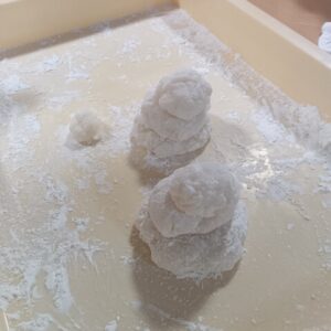 ついたお餅を素早く丸めて形を作り、固まるのを待ちます。
