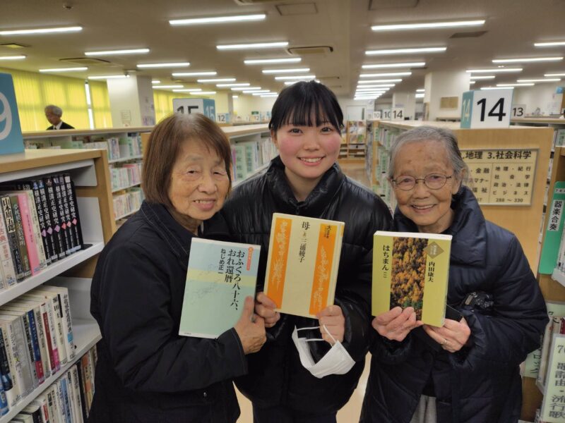 20歳の女性お二人。少し緊張しながらも、入居者さまにとても丁寧に関わってくれていた姿が印象的でした😊図書館へお出かけした日の一枚です。