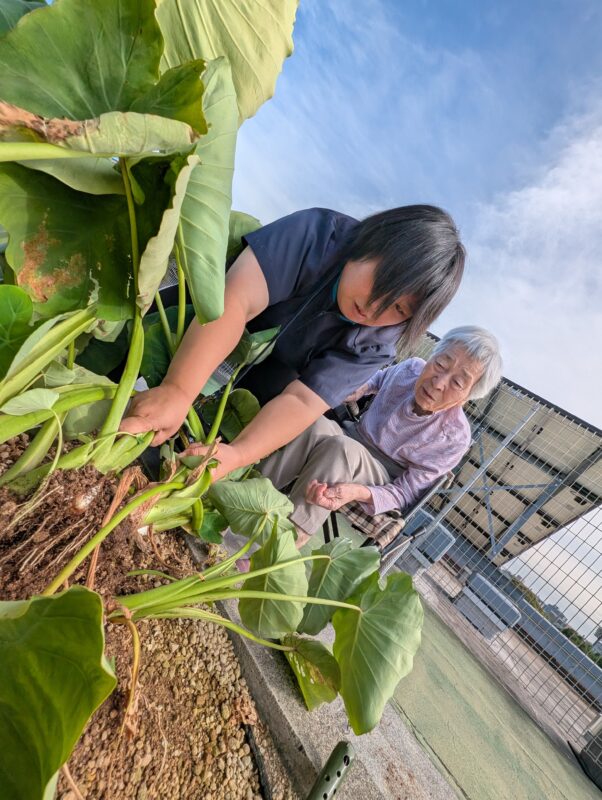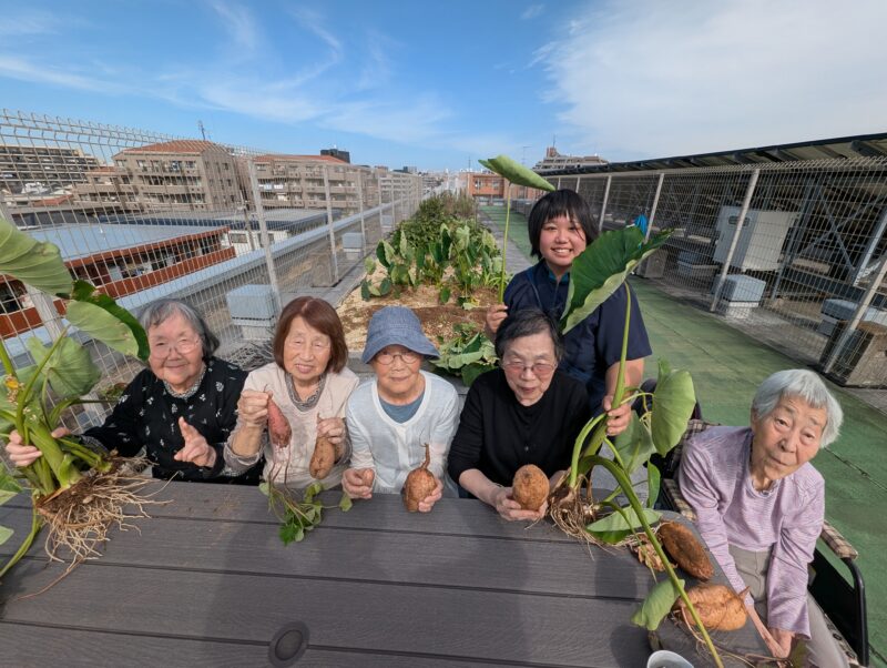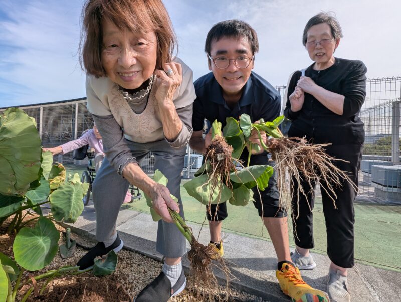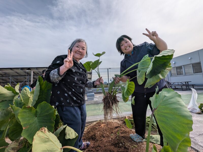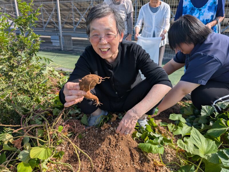 ボランティアの中本さんをはじめ、職員も一緒に汗を流しながらの収穫です。🍲10月26日は「芋煮会」家族会!
