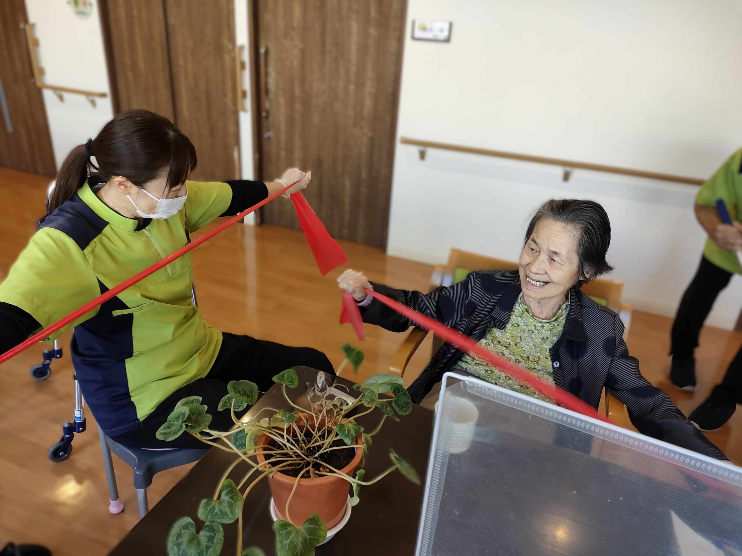 こんにちは、向日葵1.2番街です。 今日は、普段行っている機能訓練士によるリハビリの様子をお届けします。 まずは、セラバンドを使って、横に上に前にといろんな場所を伸ばしていきます。 お客様は「普段動か[...]