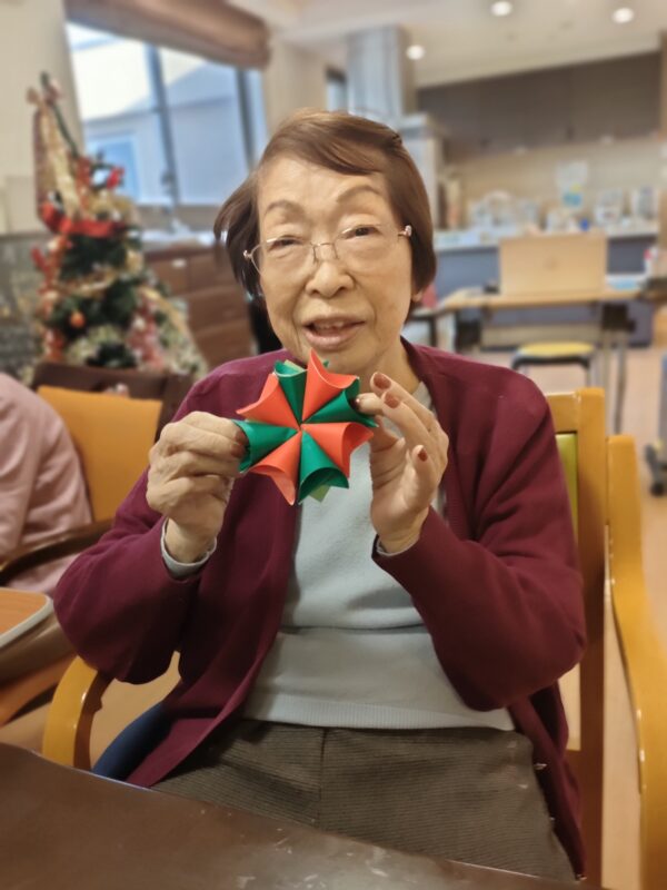 折り紙を3回折って貼り合わせ、ぷっくりとした形に貼り合わせるところが意外と難しかったですが、クリスマスらしい飾りが出来上がりました。皆様「かわいいね」「よくできたじゃない」と喜ばれていました(^^♪