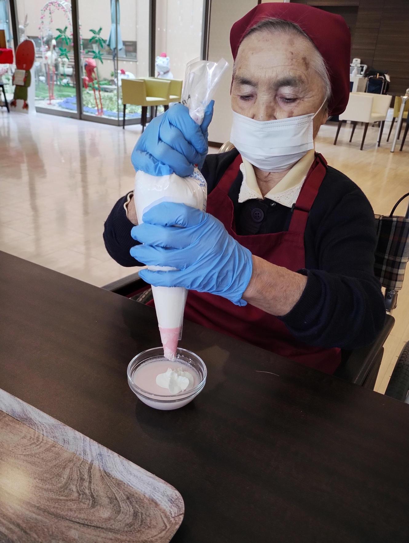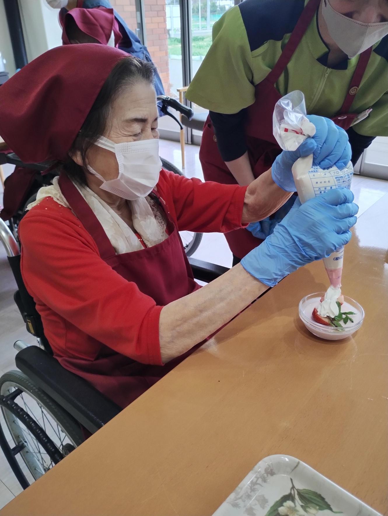 デザートのトッピングをします。