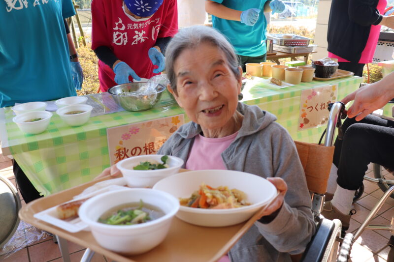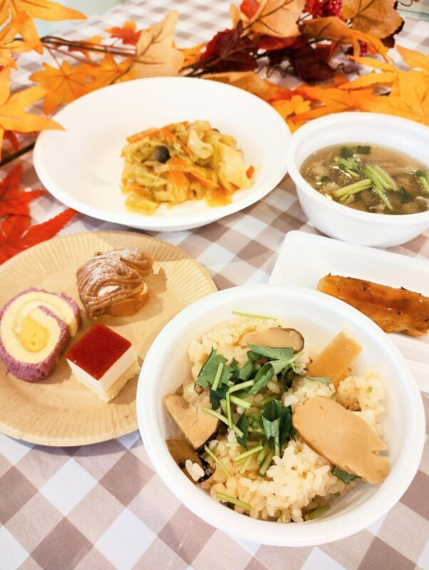 松茸ごはん、秋の根菜汁、鮭のちゃんちゃん焼き、つくね串、秋のプチケーキ3種