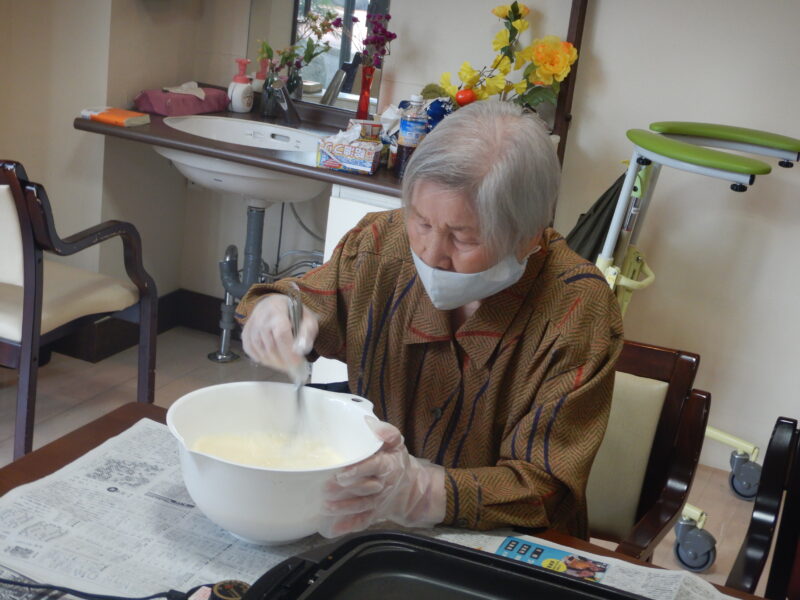 今月のおやつレクは、フレンチトーストでした。材料を混ぜるのに全集中の様子です。
