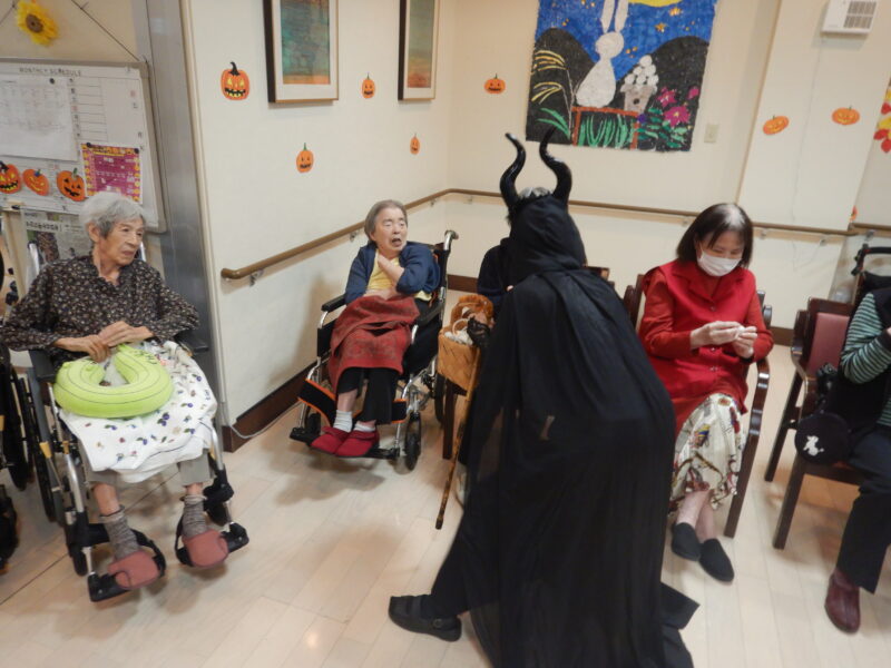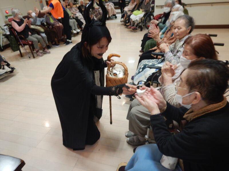 今年のデイサービスでは、魔女とゆかいな仲間たちがお菓子を配りに来てくれました。