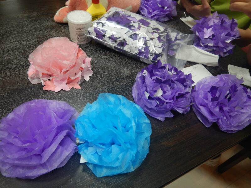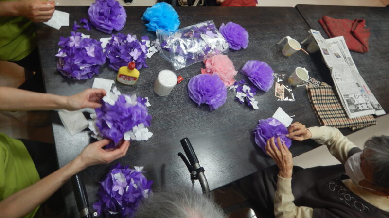 まずは折り紙を何枚か選ぶ。青、薄紫、ピンク。どれも紫陽花らしい色で迷ってしまい 単純な作業だけど、気づけば夢中になっており時間を忘れて集中していた。少しずつ丸い形が見えてきて、まるで本物の紫陽花が咲き始めるみたいで嬉しくなる。 貼る位置を少しずつずらすと、ふわっと立体感が出て、思わず「いいのができたね」と声が漏れた。