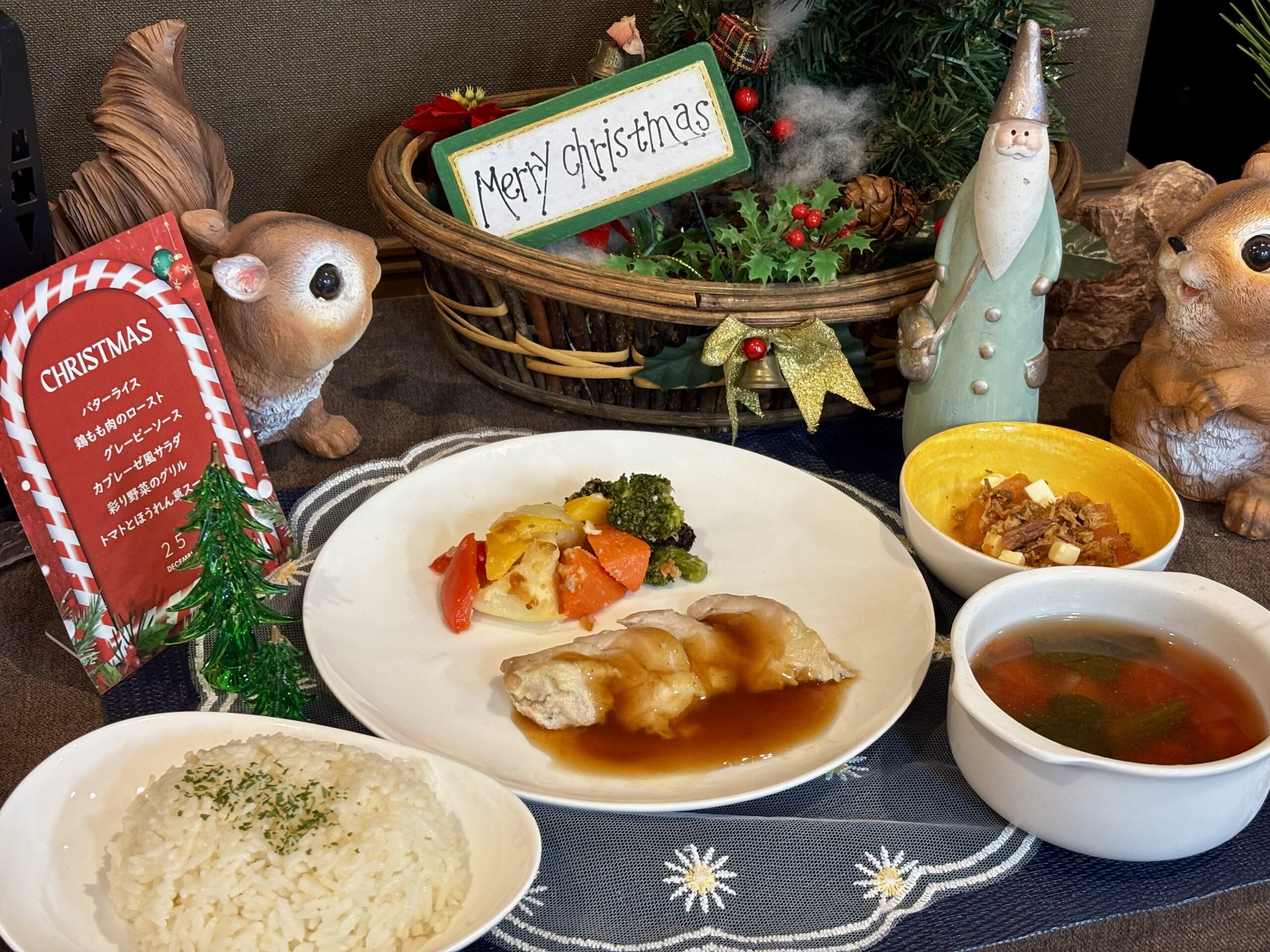 本日はクリスマスランチを開催🎅バターライスに鶏モモ肉のローストグレービーソース、彩り野菜のグリル、カプレーゼ風サラダ、トマトとほうれん草のスープと、赤・緑・白のクリスマスカラーを意識した献立をご用意し[...]