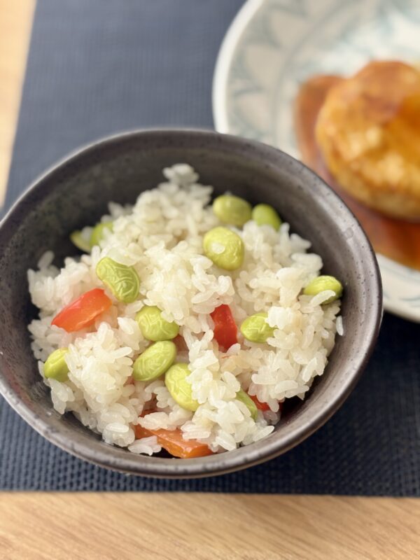 赤パプリカと枝豆の混ぜご飯、豆腐ハンバーグ照り焼きソース、彩り野菜のマリネ、フルーツ、南瓜と玉ねぎの味噌汁