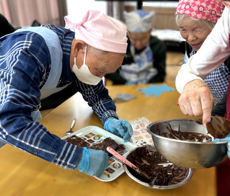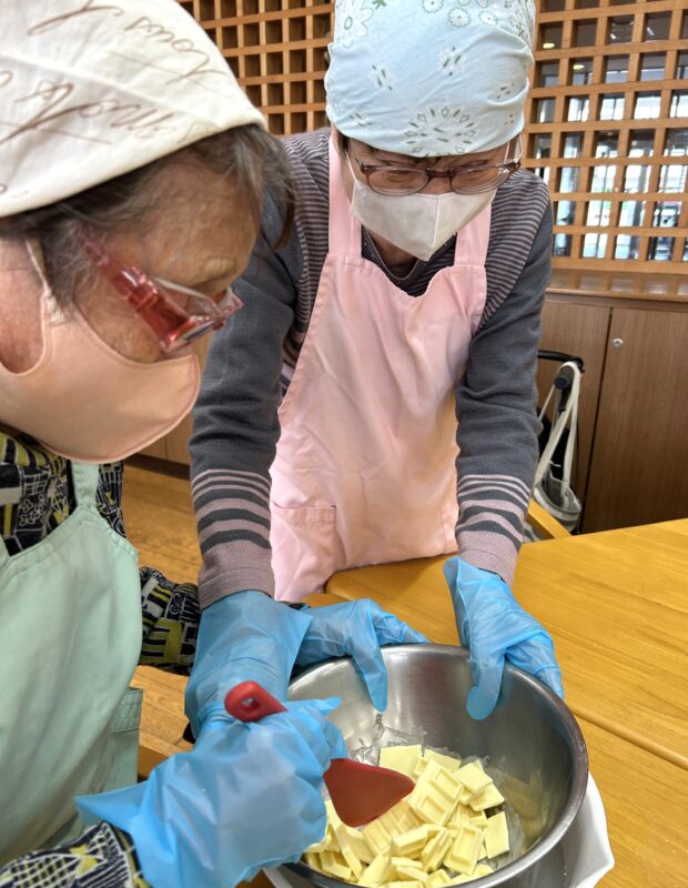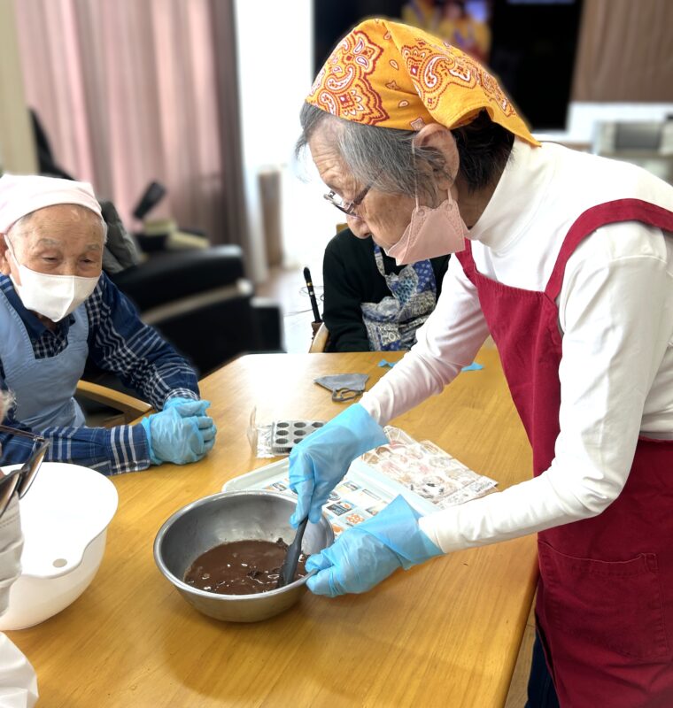 デイサービスでは、皆さんと一緒にチョコレート作りを行いました(*´▽`*)チョコを湯煎して、型に入れて、冷やし固めて、チョコレート完成‼(^^♪