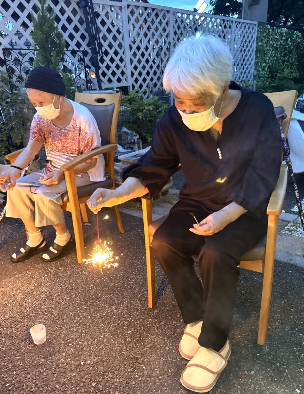 毎日まとわりつくような暑さにうんざりしていると思いますが、デイサービスのみな様は元気いっぱいに過ごしていらっしゃいます(⌒∇⌒)本日は夕涼み会。夏バテ防止には旬の物を食べるとよいと言う事で、トウモロコシや枝豆、スイカ、ソースのお味たっぷりの焼きそばを召し上がっいて頂きました。「皆で食べるとおいしいよ」とお話も弾んおりました。お食事の後は楽しみにしていた花火大会です。手持ち花火を見つめながら「童心に返ったよ」「きれいだね」「パッと散ってしまったね」花火を眺め、心に浮かんだ思いは色々だったようです。いよいよ夏本番です!楽しく過ごしていきましょう!!