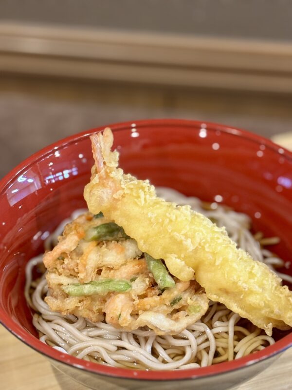 本日の夕食は、海老天とかき揚げ天を添えた年越しそばをご用意しました。