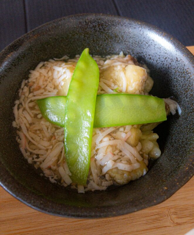 豚肉と半熟卵の冷製うどん、焼き茄子のかにかまあんかけ、鶏五目煮豆