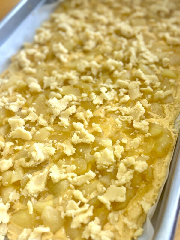 ケーキ生地の上にフィリングをたっぷりのせ、仕上げにクランブルを散らしてオーブンへ。