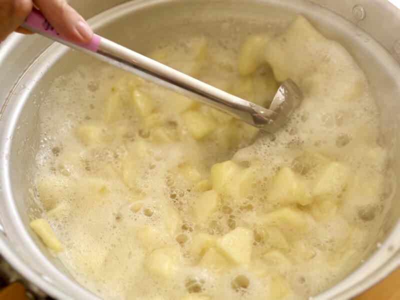 皆さま、りんごの皮むきはお手のもの。あっという間に下準備が終わり、りんごをコトコトと煮ていきます。