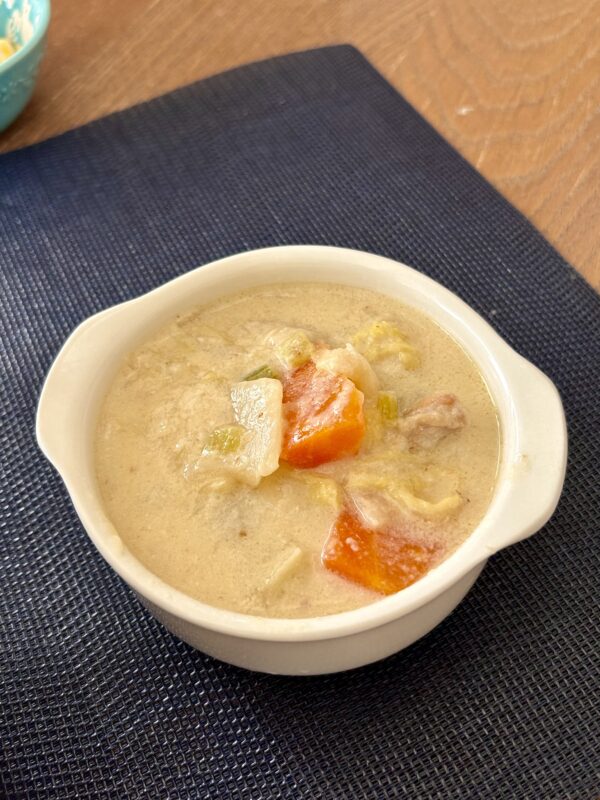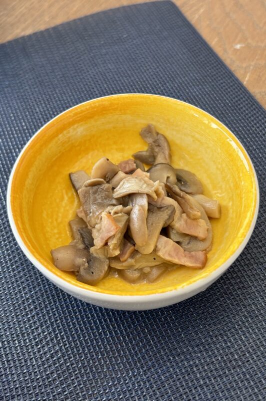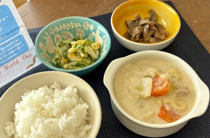 メインは「鶏肉の味噌ビールシチュー」ベルギー料理のビール煮込みを日本の味噌でアレンジ。白みそと赤みそを合わせコクのあるまろやかな味わい👌鶏肉もビールのおかげでとっても柔らか😊副菜には「ブロッコリーのサラダ」と「きのこのバターソテー」を添え、彩りと香り豊かな一皿に。