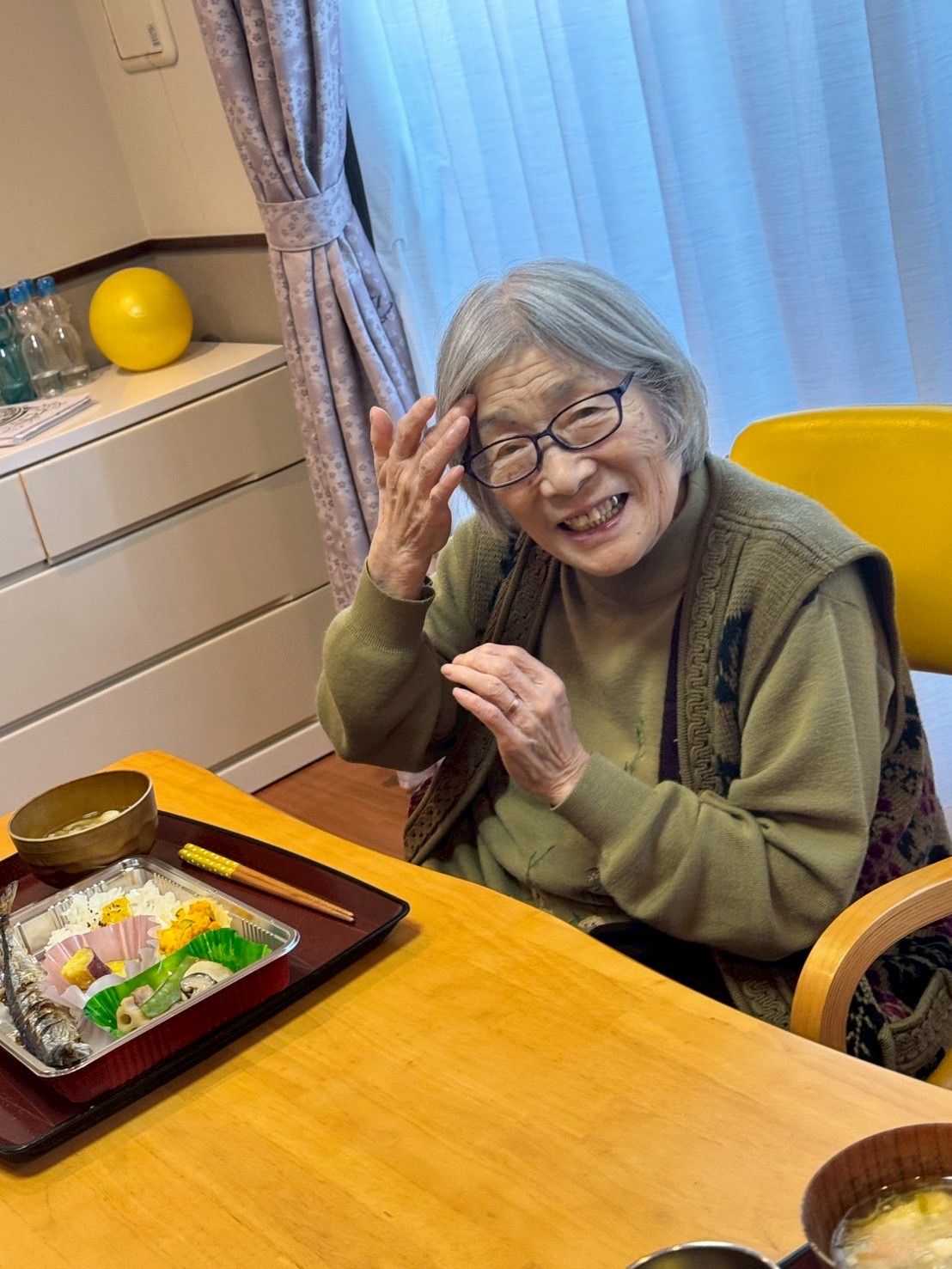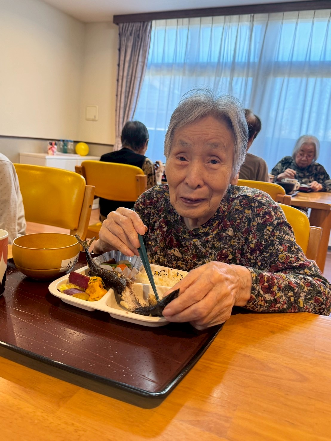 先月のことですが、れんげユニットでは“秋を感じよう!!秋と言えば食欲の秋だ!!”ということで、お昼ご飯に🍁紅葉弁当🍁とおやつに🍇秋のフルーツ盛り合わせ🍎を召し上がっていただきました❢