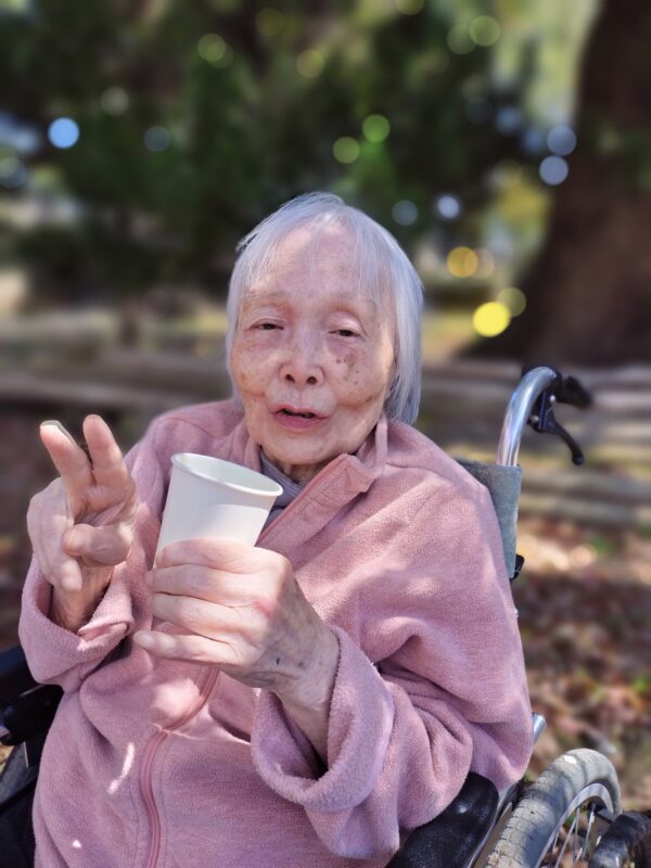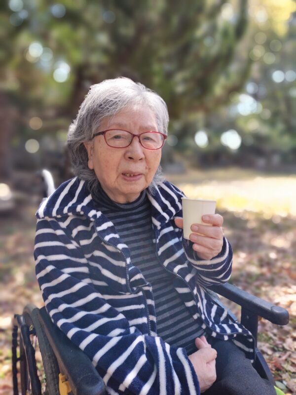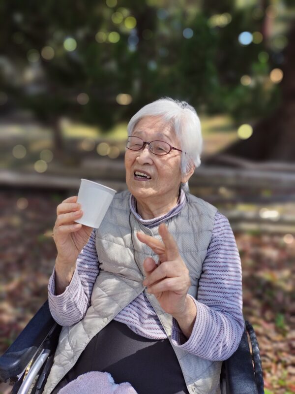 「きれいだね」「外に出ると気持ちがいいね」といったお声も聞かれ、自然と笑顔があふれていました。桜を眺めながら写真を撮った後は、ジュースを飲みながらひと休みする時間もあり、ゆったりとしたひとときを過ごしていただきました。