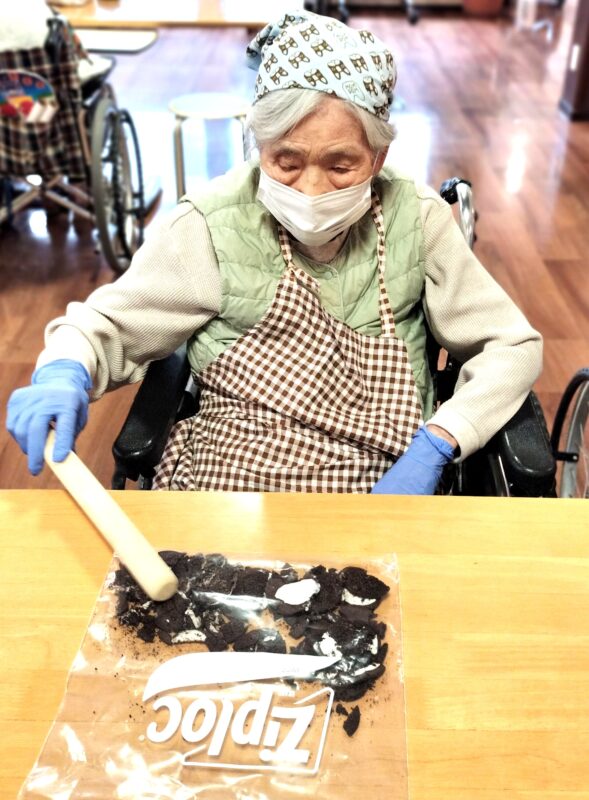 お客様には土台になるクッキーを砕いたり、材料を混ぜる作業をお手伝いしていただきました。