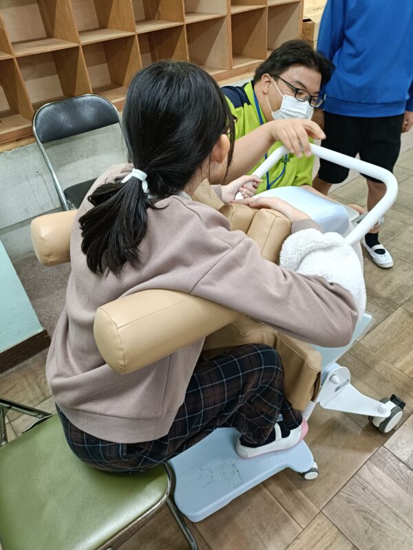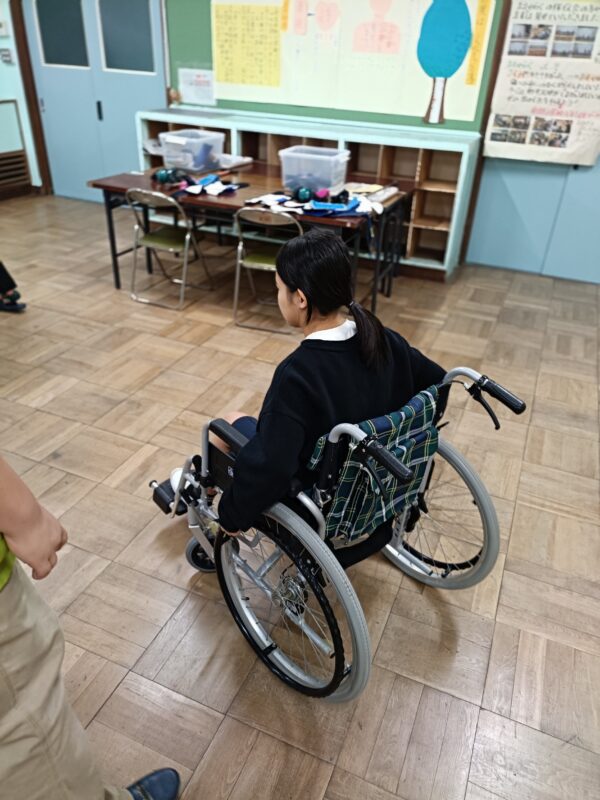 車いすに乗るのは初めてという生徒も多く、普段見ることのないリクライニングタイプの車いすに驚いたりしながら、興味深く体験していただきました。