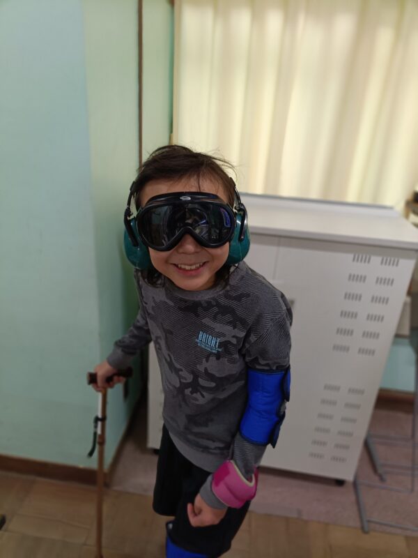 高齢者疑似体験では、ゴーグルを着用して、視野が狭くなる体験と白内障の体験(黄色くぼやけて見える)。