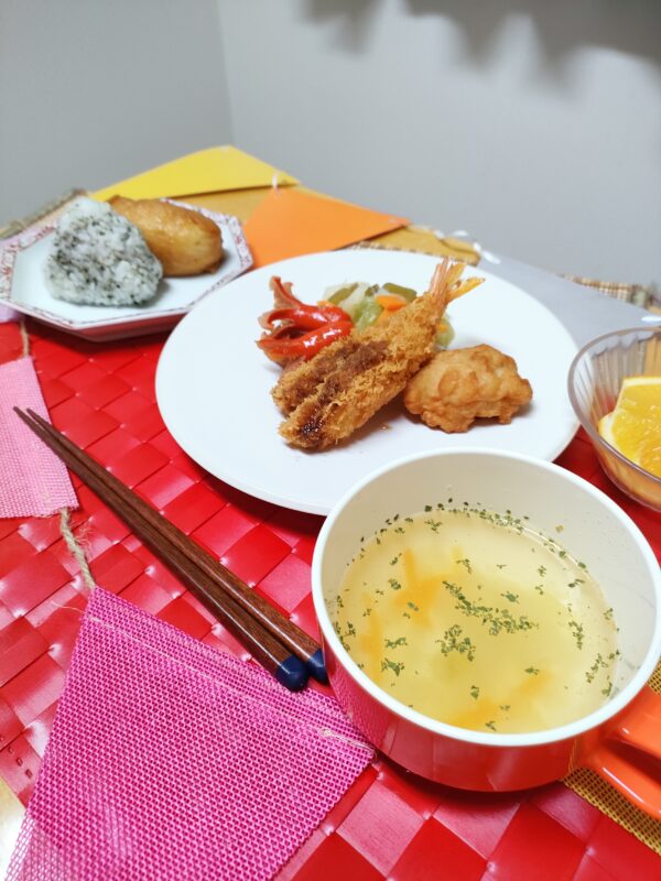 ・おかず盛プレート(エビフライ・から揚げ・タコさんウィンナー・野菜炒め)