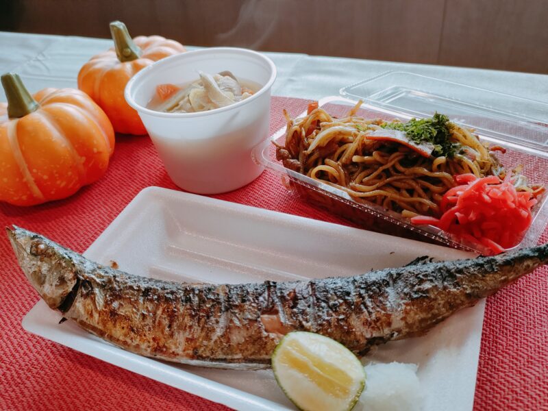 天候の都度で防災フェアは急遽中止となってしまいましたが、秋の味覚の定番「さんま」をメインに、焼きそばと豚汁をご用意しました!