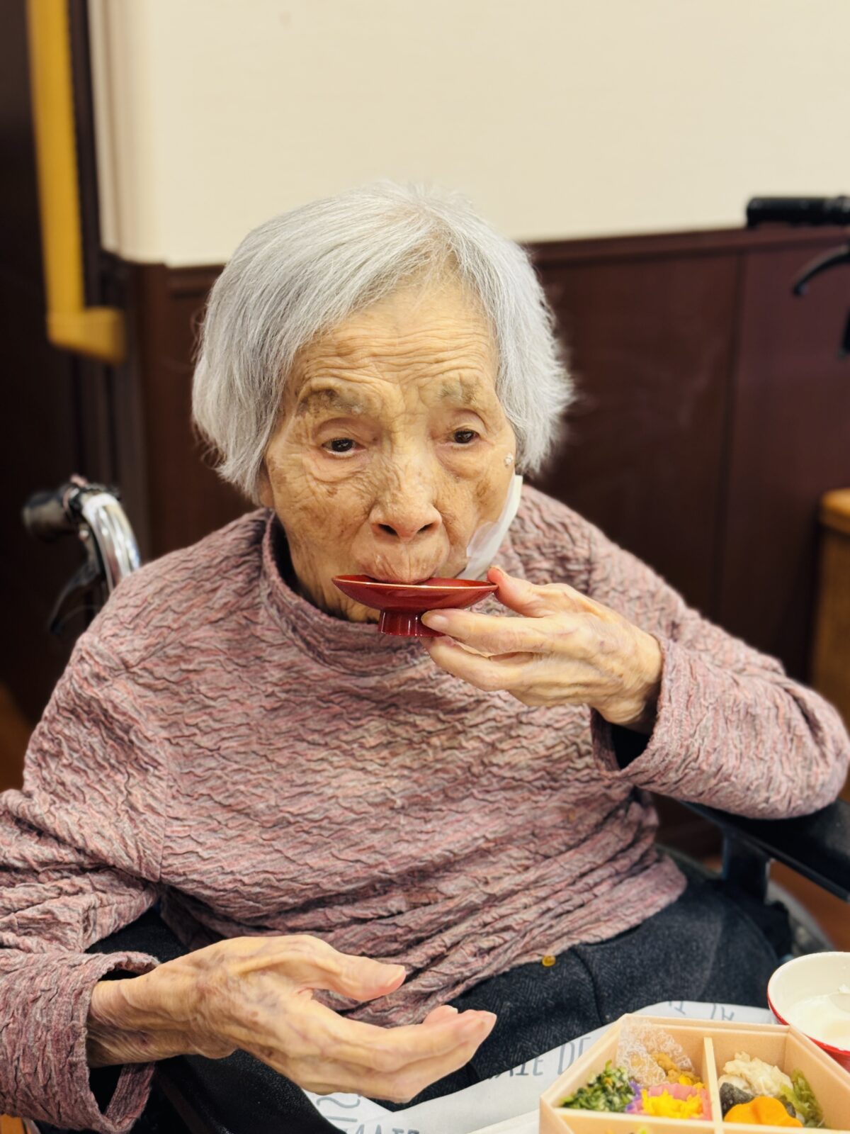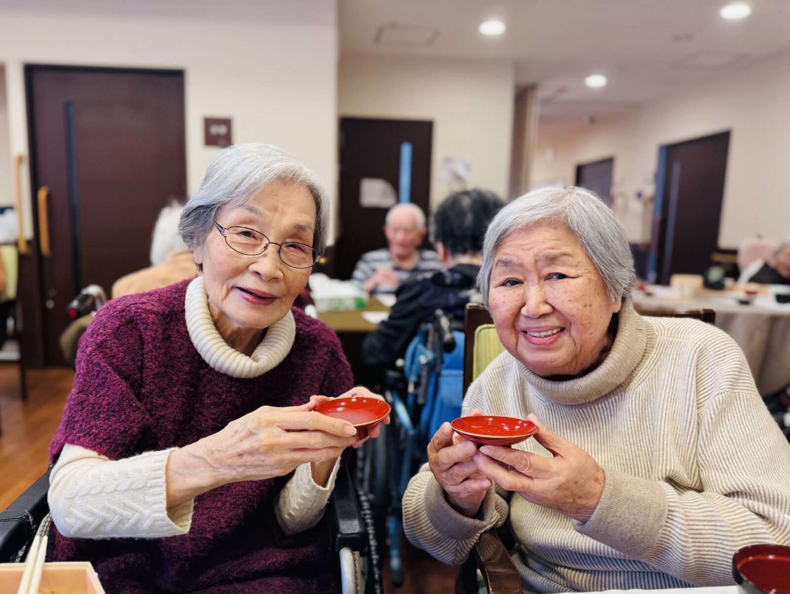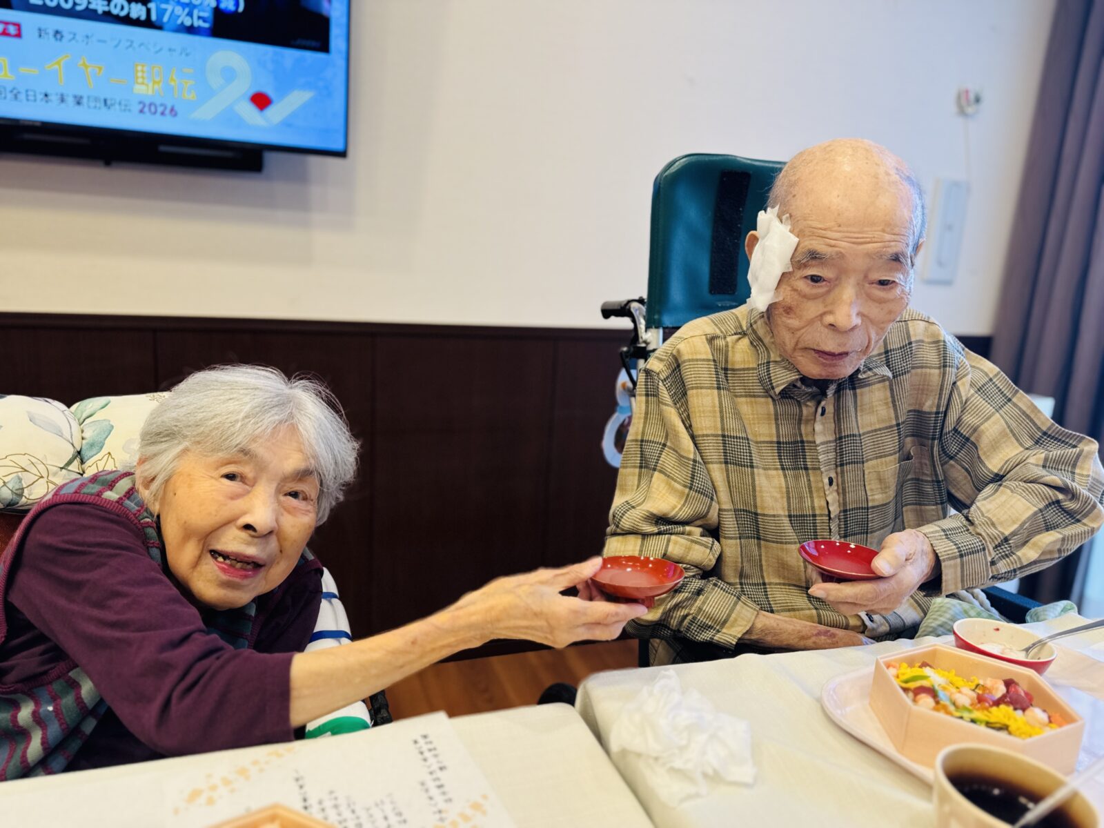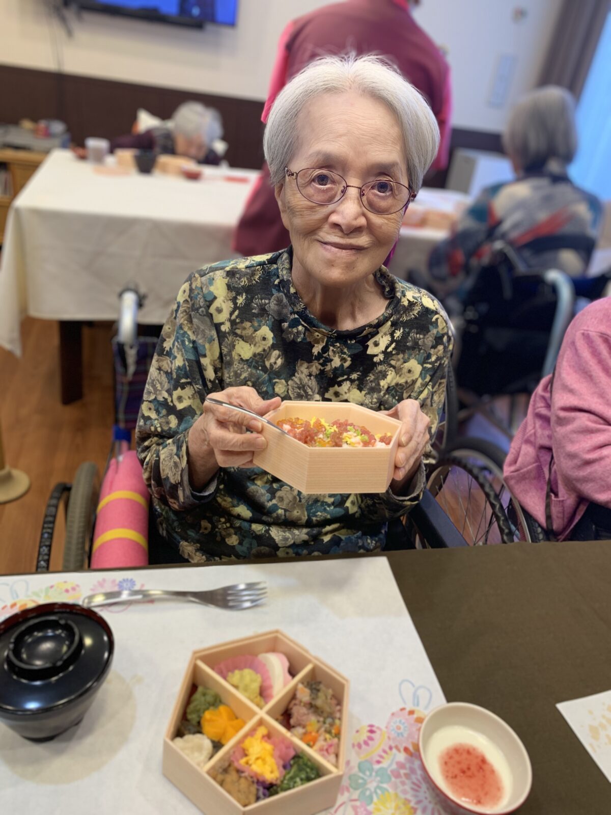 今日はお正月ということで、昼食に豪華なおせち料理が振舞われました!バラちらしやサーモン若草焼き等の見た目も華やかなお料理に皆様舌鼓を打っていらっしゃいました♪