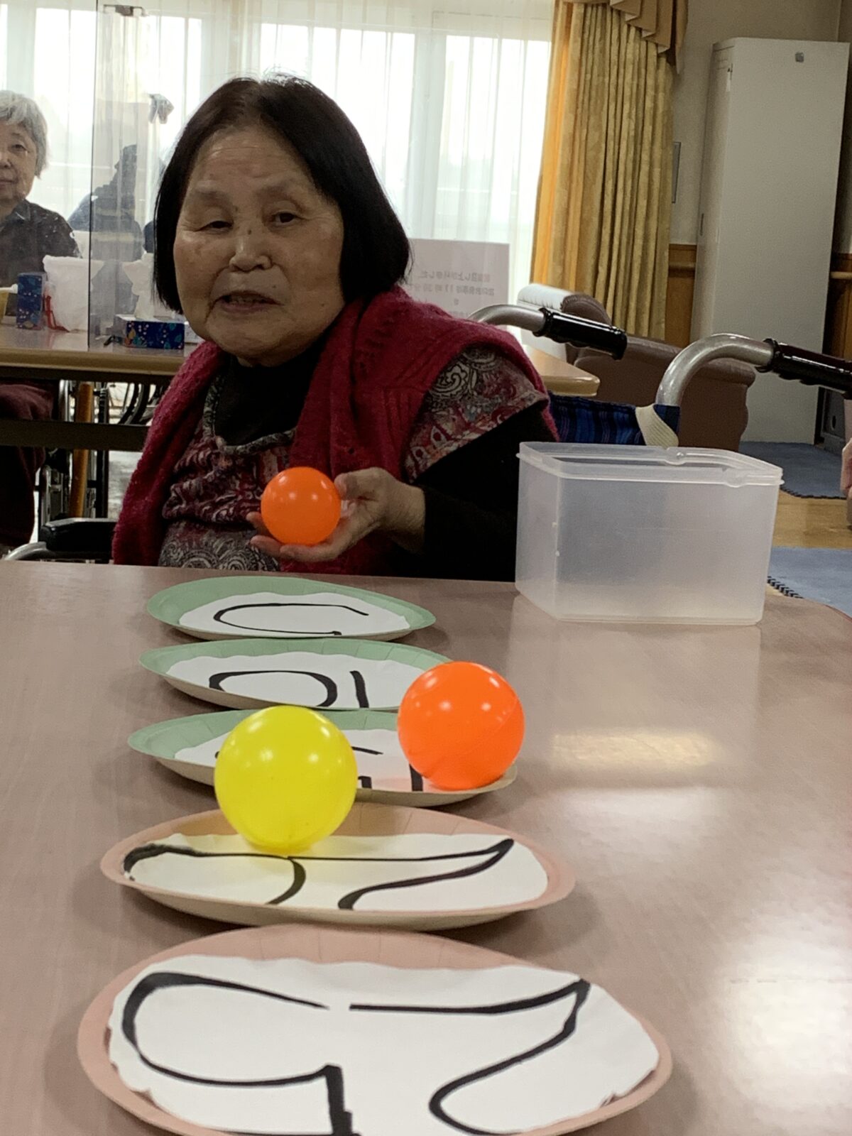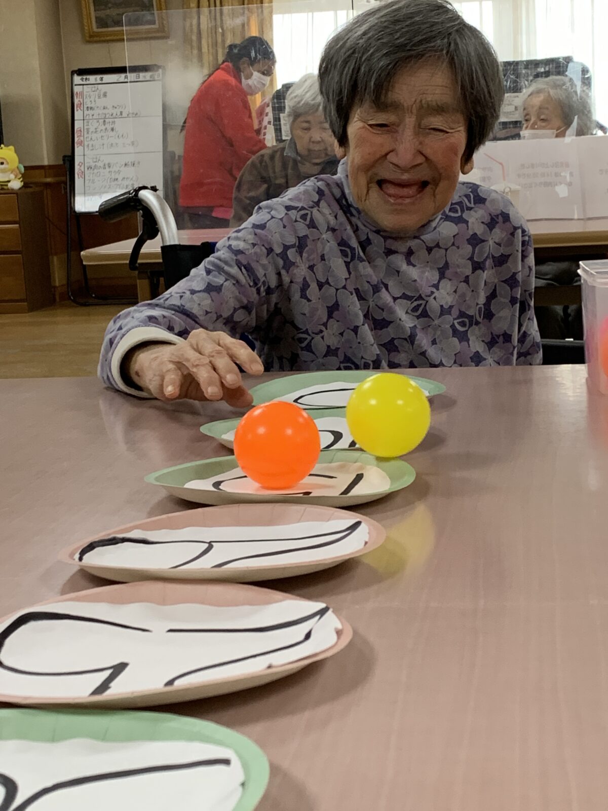 数字の書いてあるお皿にボールを転がして乗った数の合計を競う遊びをしました。