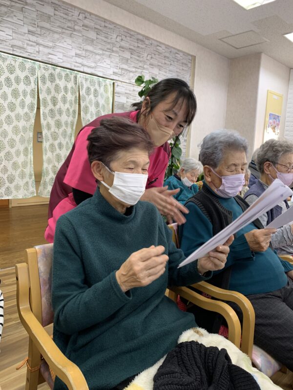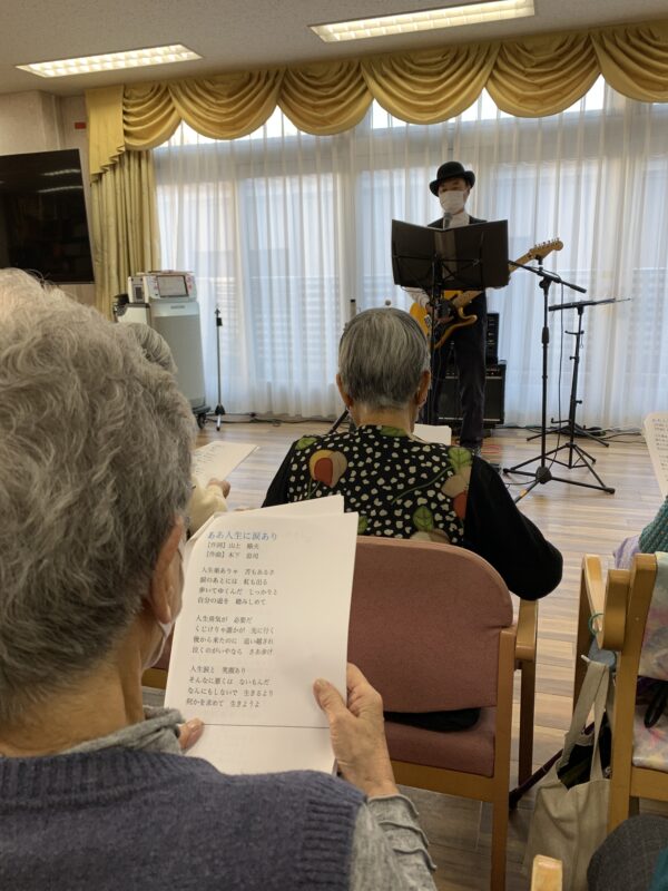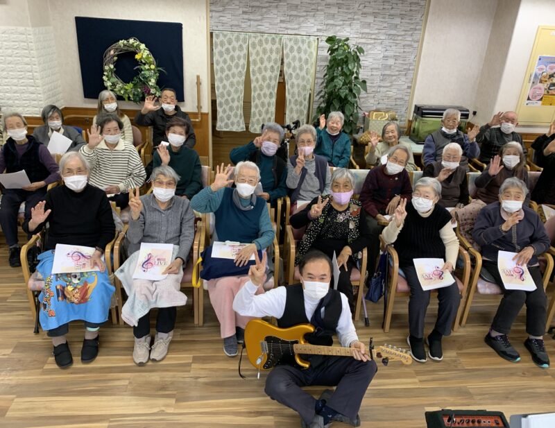 職員によるギターコンサートを開催しました!!ピンキーとキラーズのキラーズを思わせる装いで登場すると会場からは「おぉ~!」と歓声が上がり、一気に昭和ムードに☆皆さんの青春時代を彩った昭和歌謡曲を中心に、全11曲を披露。曲の合間には当時の思い出話やエピソードも交え、口ずさんだり手拍子をしたりと、自然と笑顔が広がっていました。最後には、「もう1曲!」の声にお応えしてアンコールも♪余韻そのままに記念写真も撮りました~。音楽と笑顔に包まれ、青春がよみがえるひとときとなりました☆