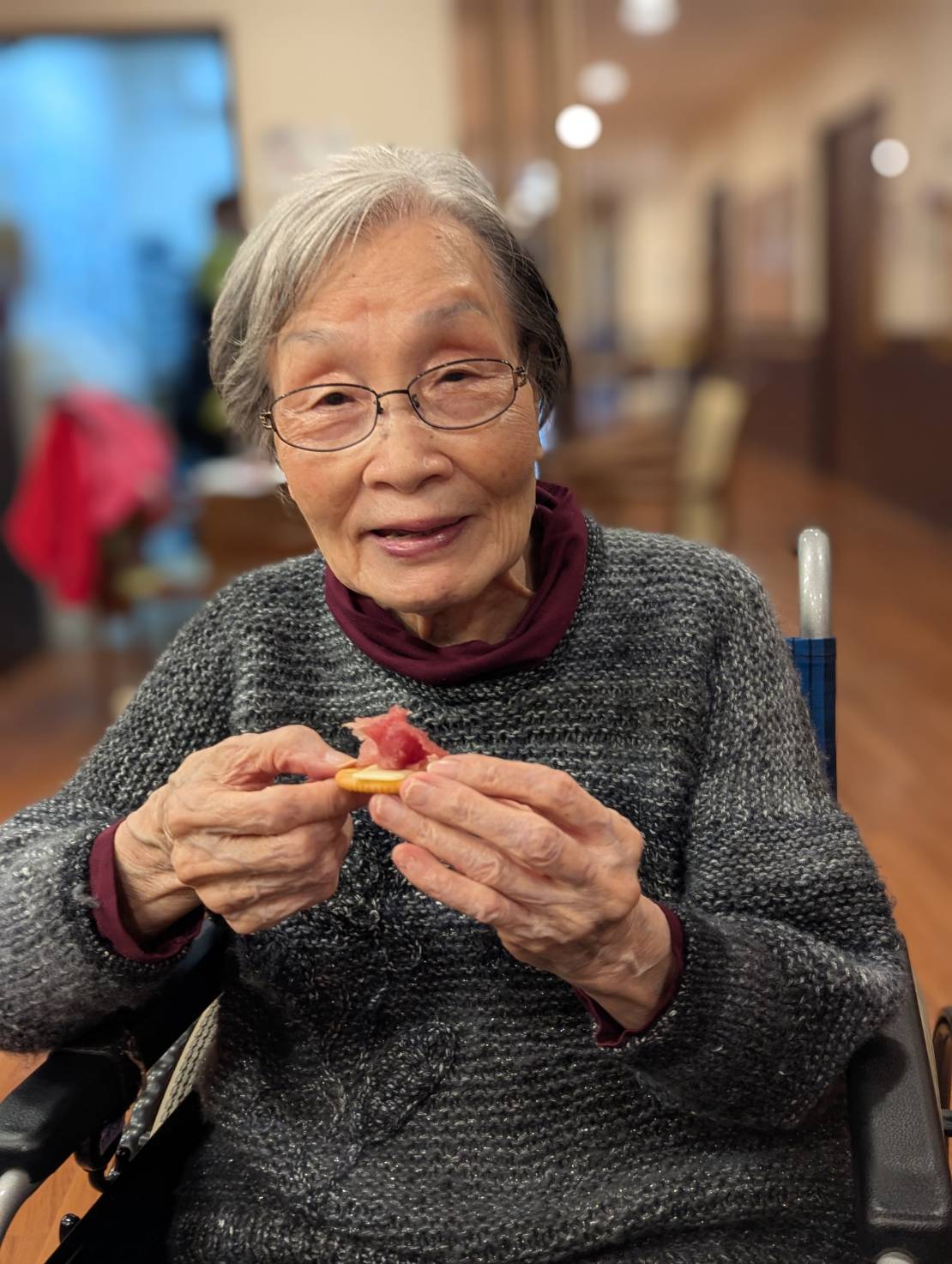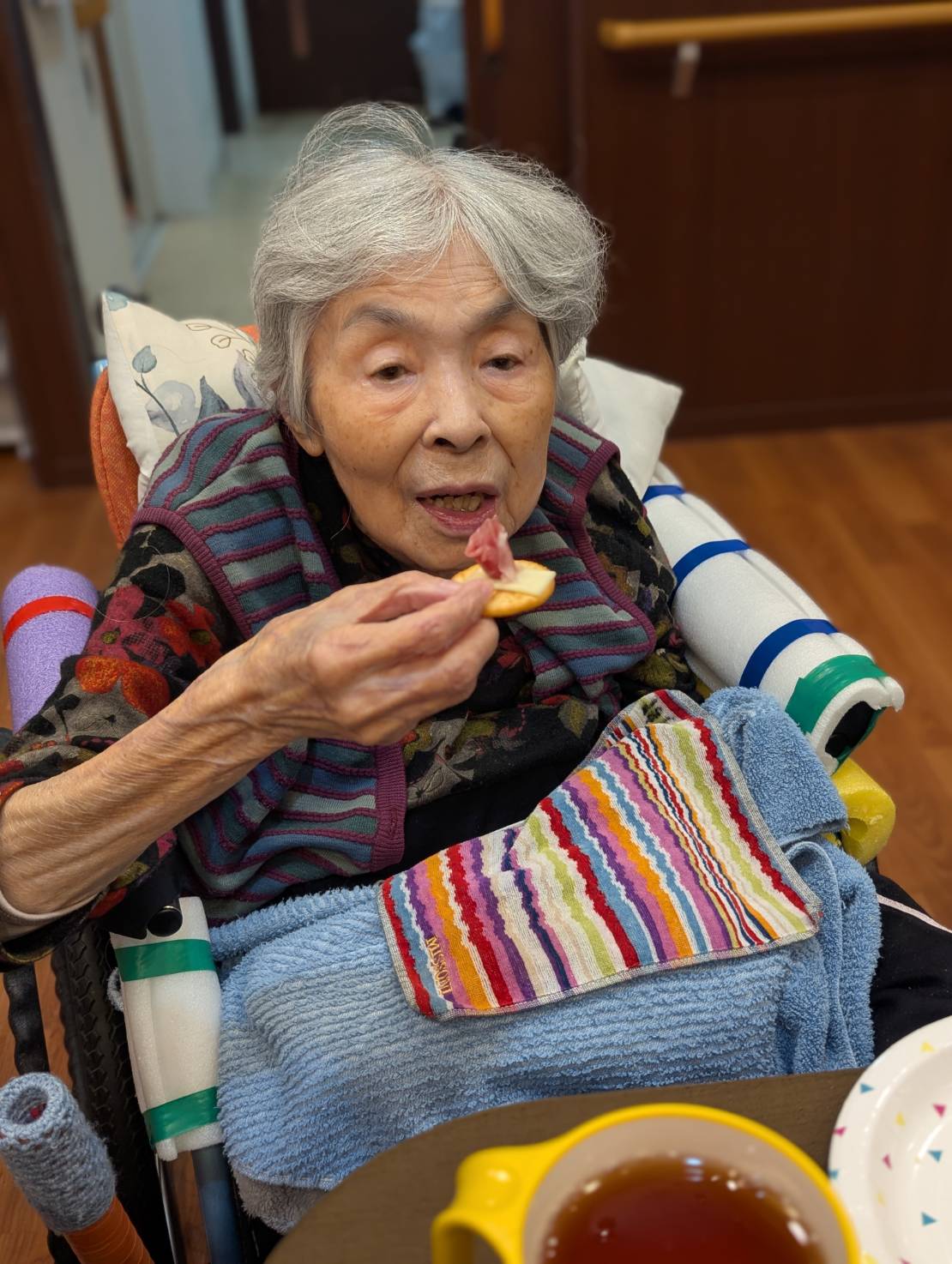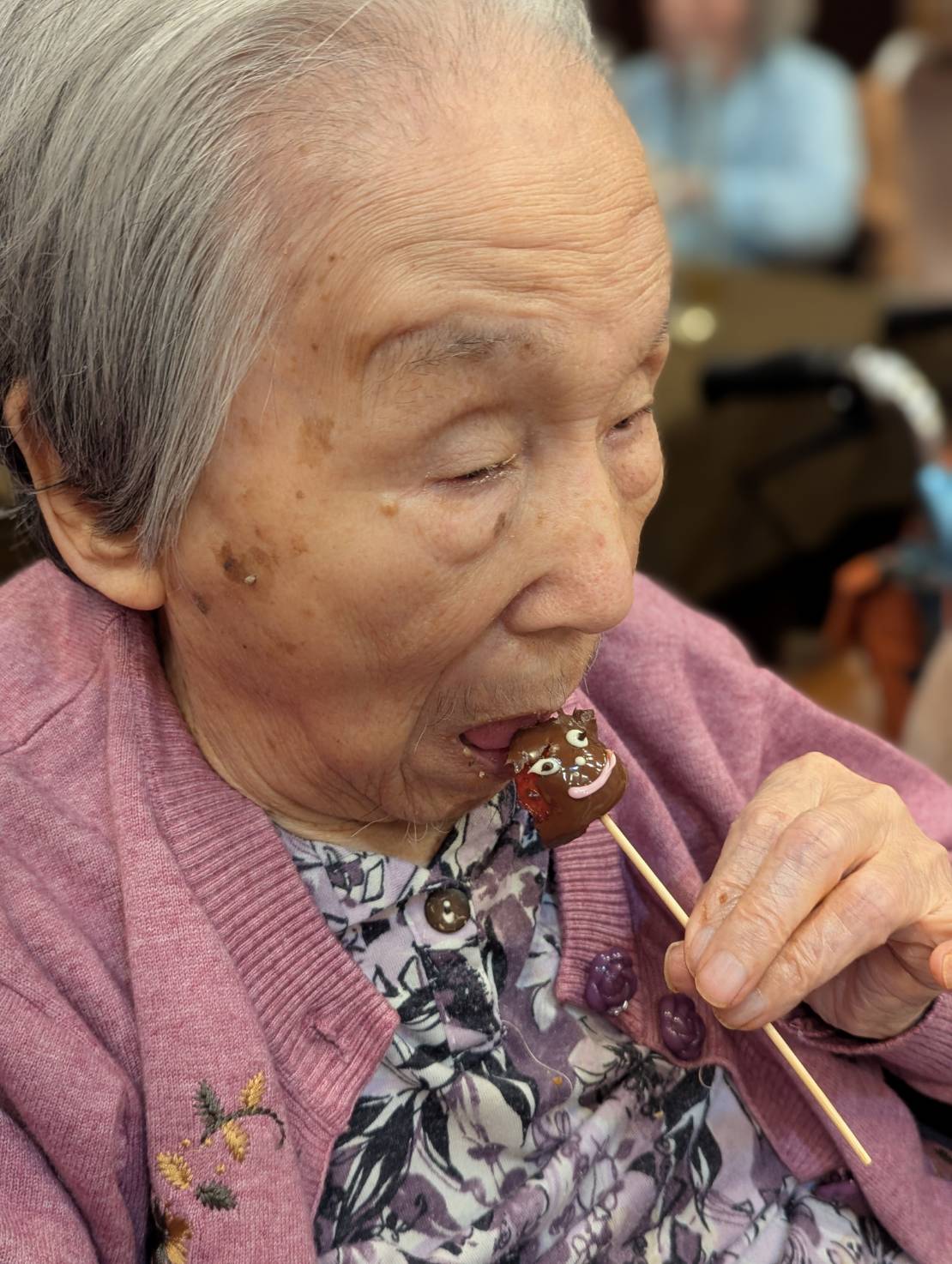 おやつの時間に生ハムやマッシュポテトのオードブル、チョコムース等を皆様と作り、シャンメリーと一緒に召し上がっていただきました!事前に皆様と飾りつけしていたクリスマスツリー等の飾りに囲まれて、とても賑やかなパーティーとなりました♪