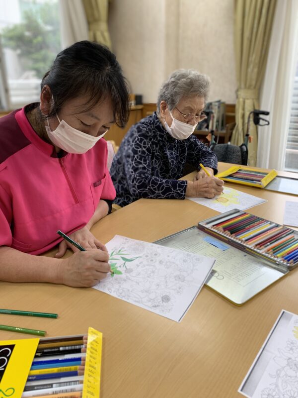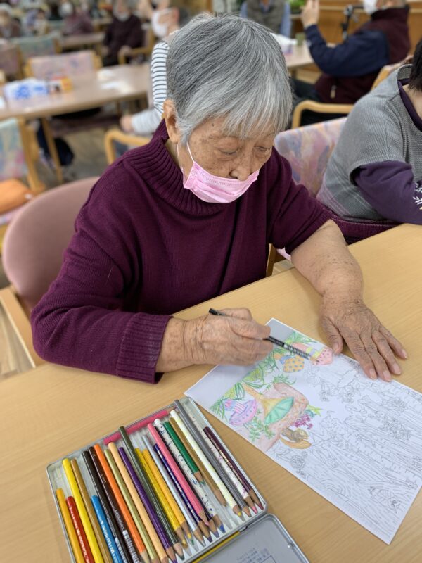 今日は一日寒い日になりました。デイサービスではコロリアージュに挑戦しました。細かい絵柄でしたが最後まで皆様頑張って取り組まれました。