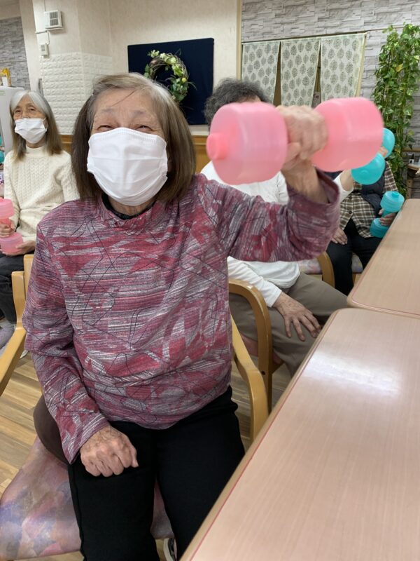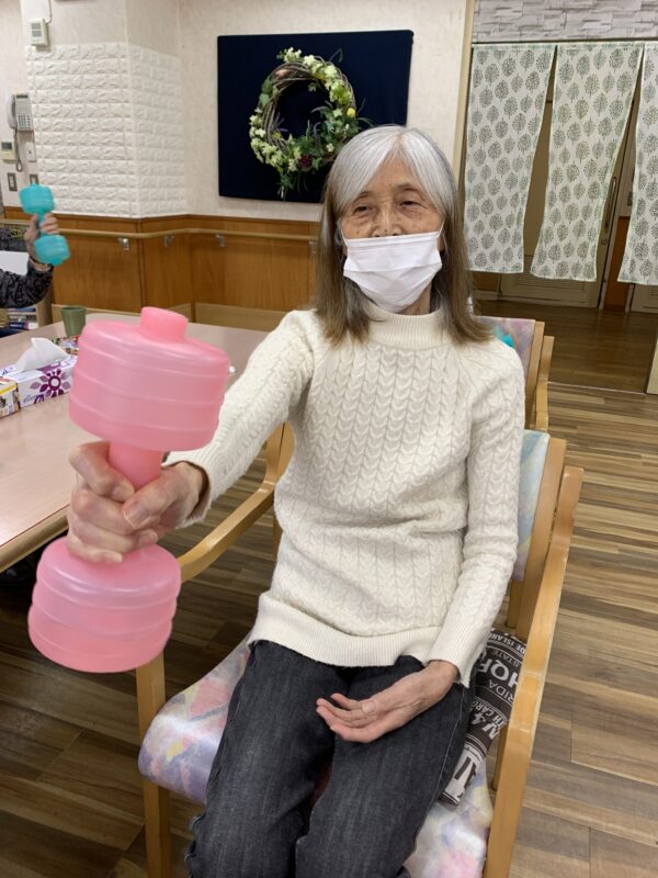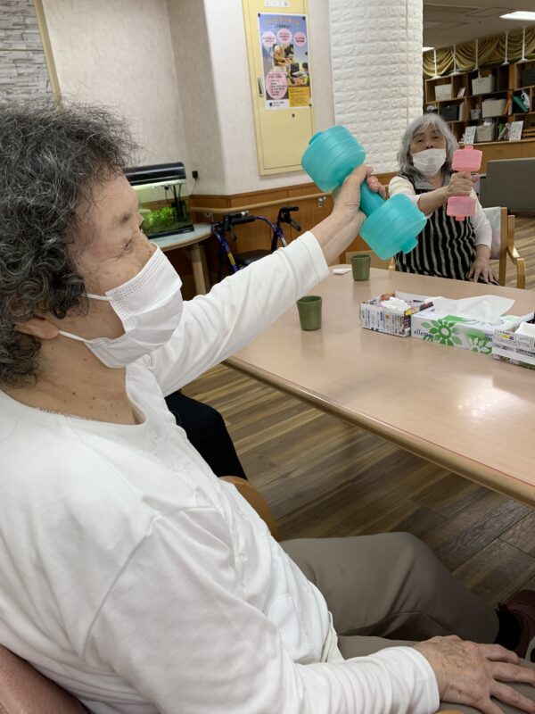 こんにちは!今日は午後から皆でダンベル体操にて体力づくりを行いました。上半身を集中的に行い、身体を鍛えていきました。