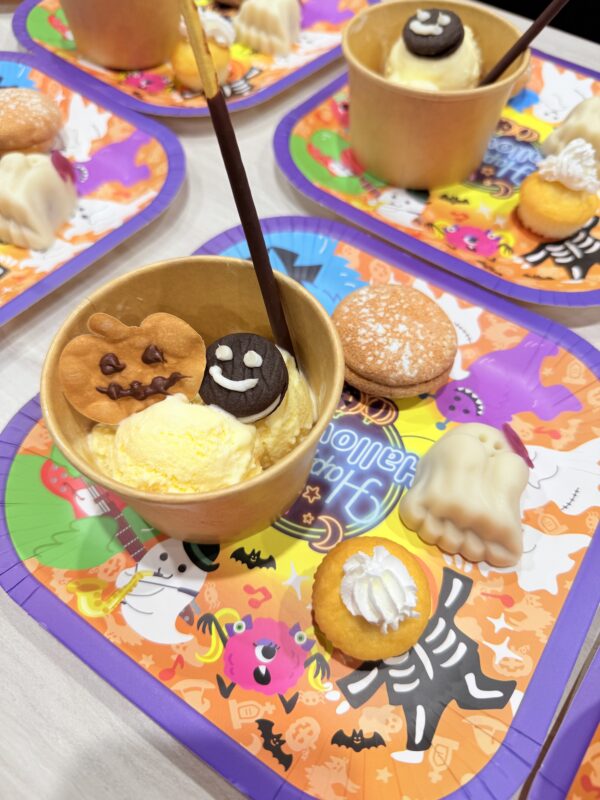 バニラとキャラメルとクッキーアンドクリームの3種類のアイスから2種類を皆様に選んでもらい、カボチャやオバケなどのハロウィンにちなんだトッピングをした可愛いデザートを召し上がっていただきました!