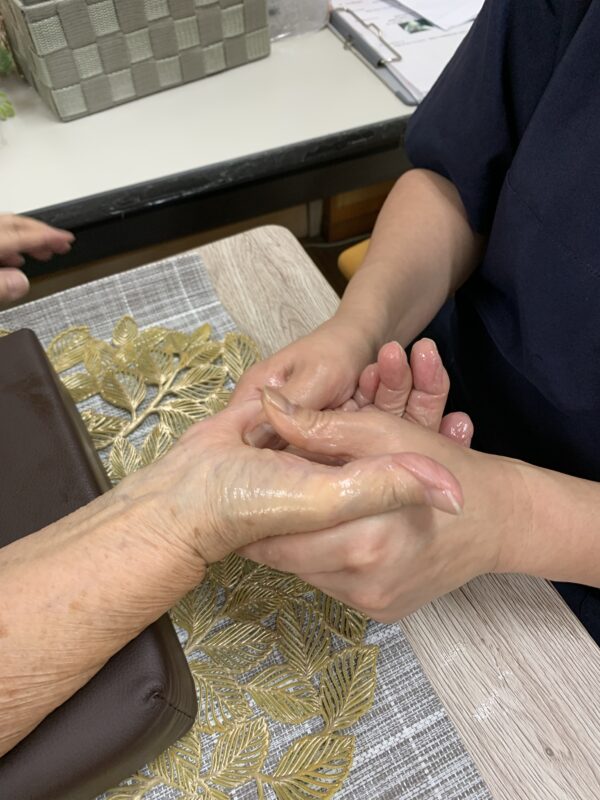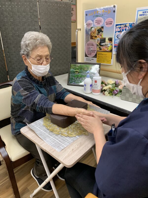ハンドマッサージの様子です!!お好きな匂いを選んで頂き、職員によるマッサージが始まります♪マッサージ中にはウトウトされてしまう方も居たり、お話がいつもよりはずんだりと楽しい時間を過ごすことが出来ました。