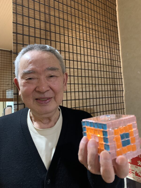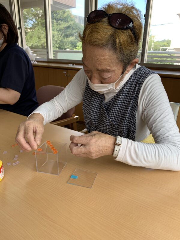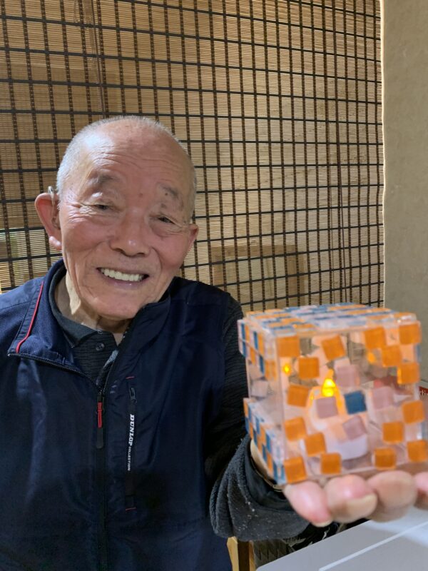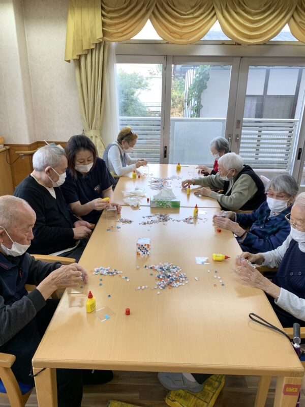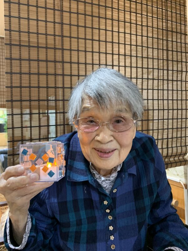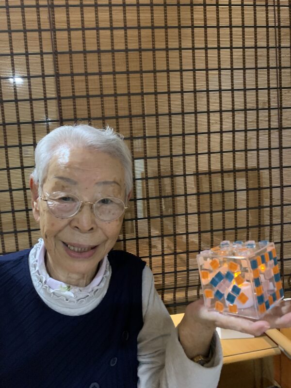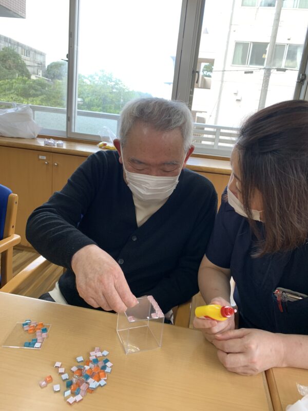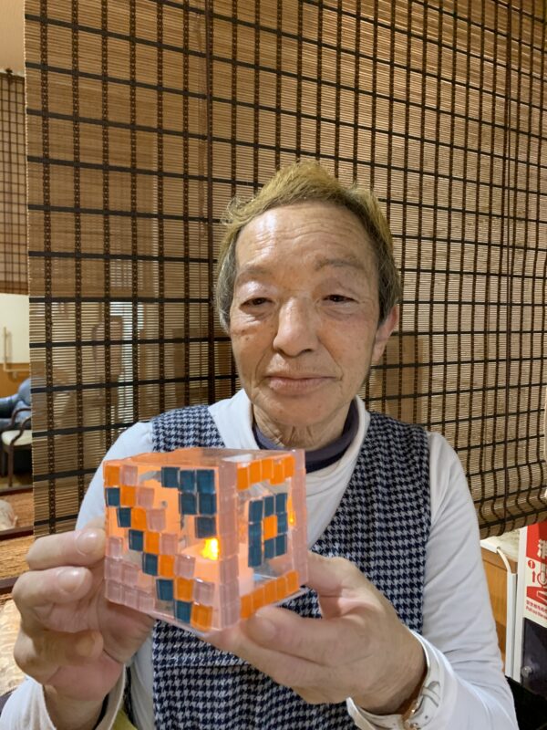 こんにちは!!今日は午後からランプシェード作りを行いました。クリアケースに小さなタイルを貼り模様を作ります。皆さん集中して、思い思いの色や形を選びながら作業に取り組んでおられました。箱の中にライトを灯すと光がタイルを通して美しく広がり素敵な作品に仕上がりました!!
