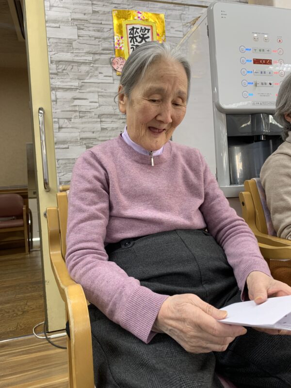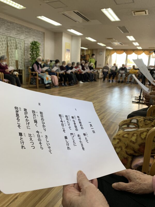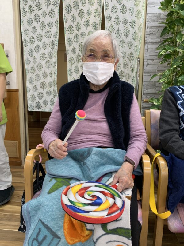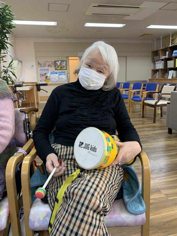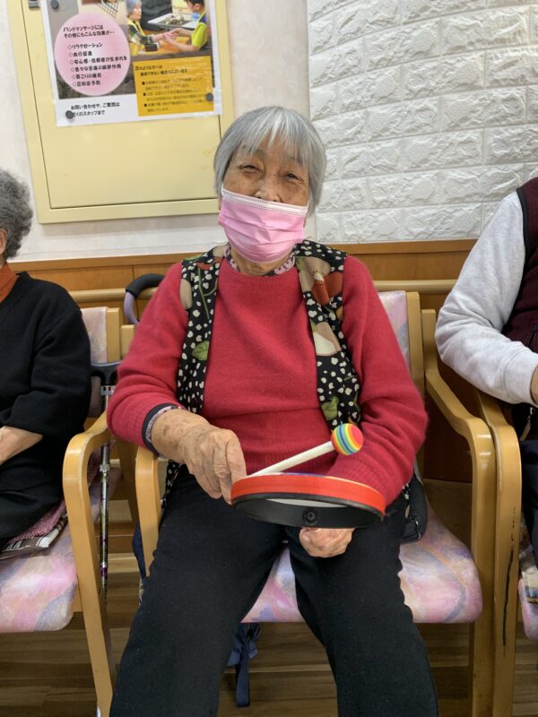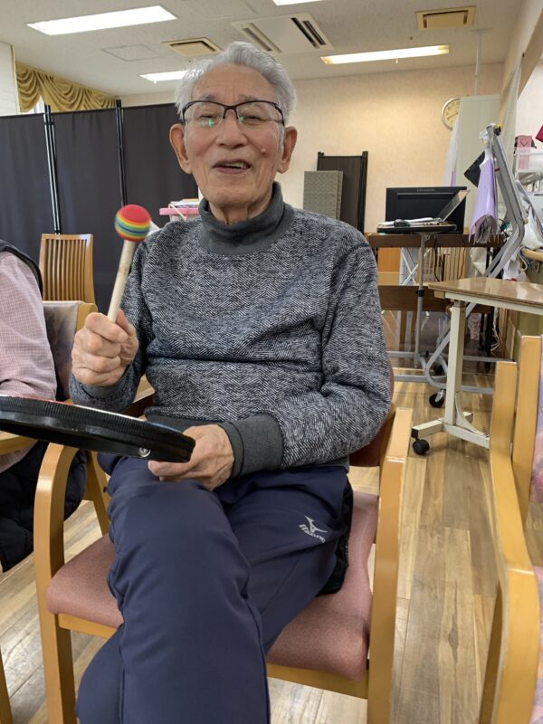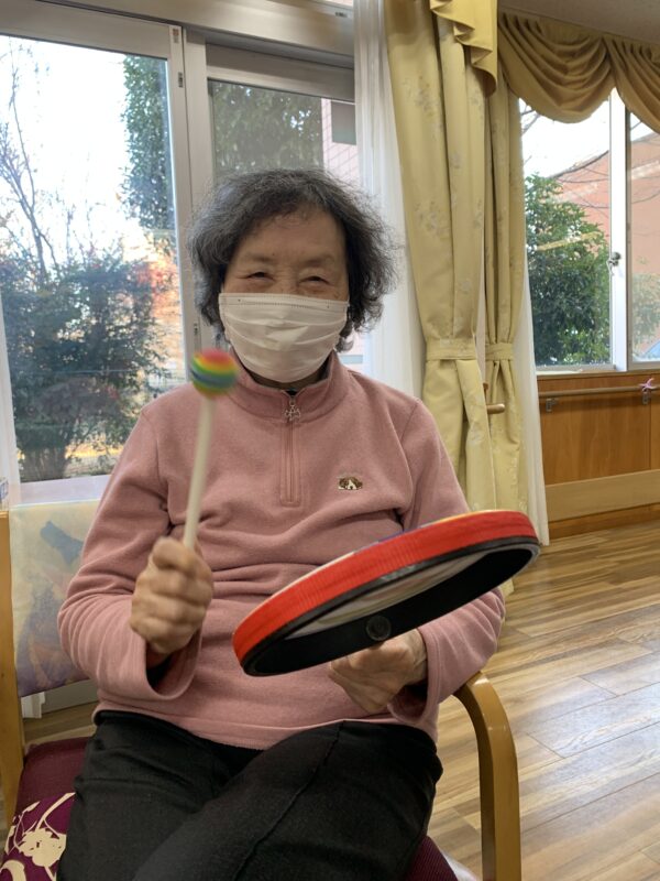 新年を迎え、年末ぶりに顔を合わせた方々との再会を喜び合う声と笑顔が、フロアのあちこちで見られました。そんな和やかな雰囲気中、午後からは今年初の音楽療法です!!お正月にちなんだ曲からスタートし、自然と笑顔が広がり心がポカポカ温まる時間となりました。