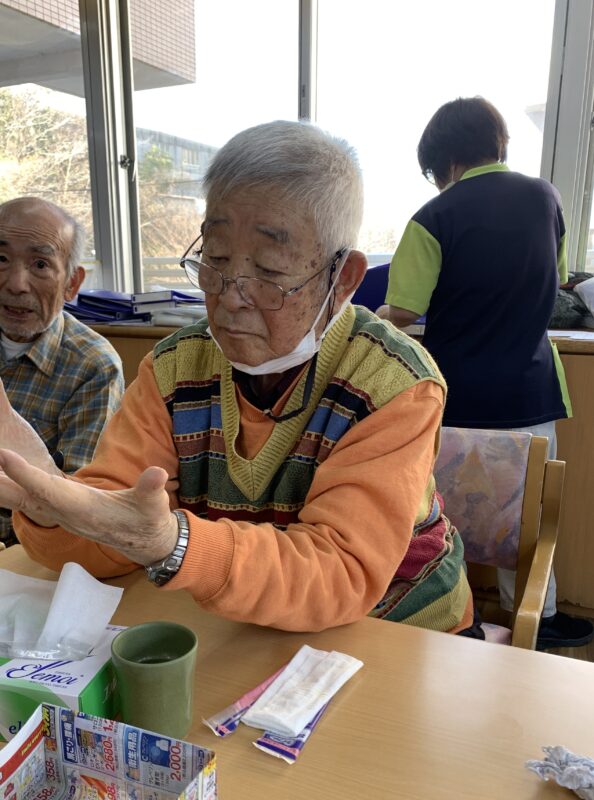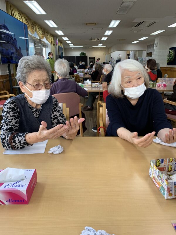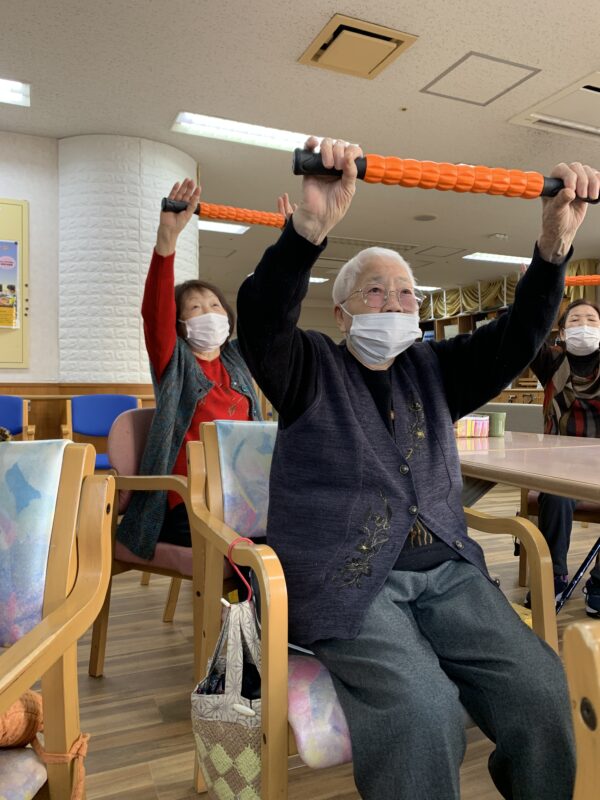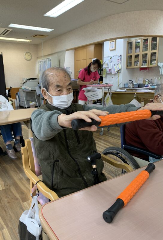 年末の大掃除に取り掛かり始めたというお話を耳にし、今日は「お掃除に備える体作り」をテーマに棒体操を行いました。高いところの物をとる動作や、床に落ちたものを拾う動作をイメージしながら無理のない範囲で楽しく体を動かし、寒さで丸まりがちな背中も気持ちよく伸ばせたようです♬