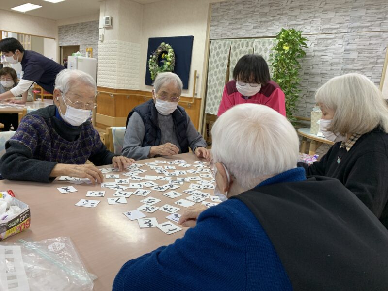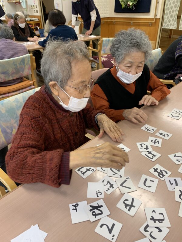 午後は、チューブ体操でしっかりからだを動かし、そのあとはひらがなかるたで脳トレ♪同席の方々と協力して、真剣に取り組まれておられました。