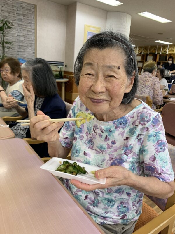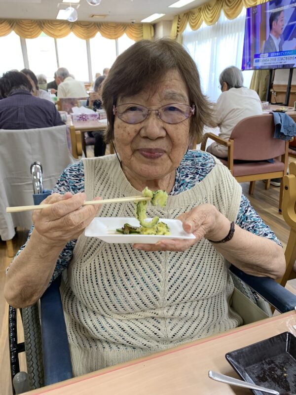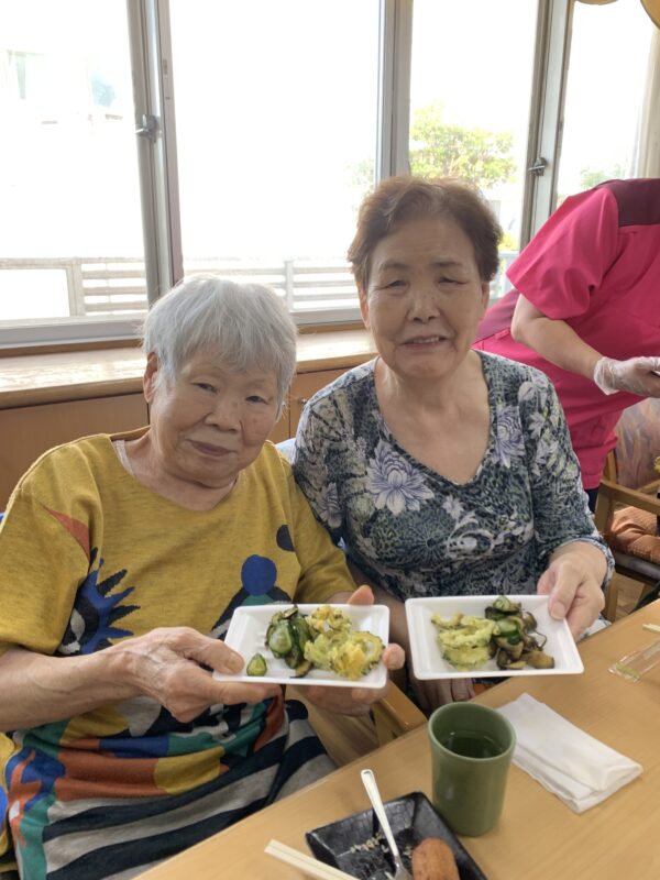 デイサービスで育てた野菜を使いゴーヤ天ぷら・浅漬け・野菜たっぷりスープの三品を召し上がって頂きました♬