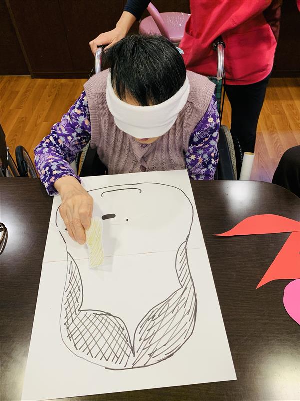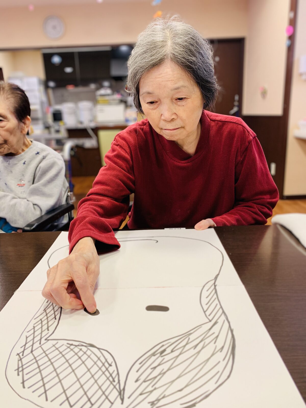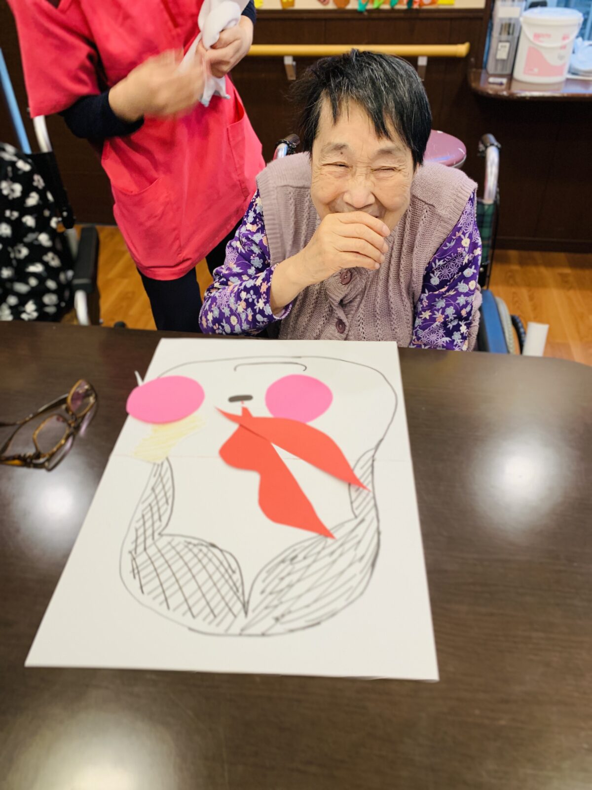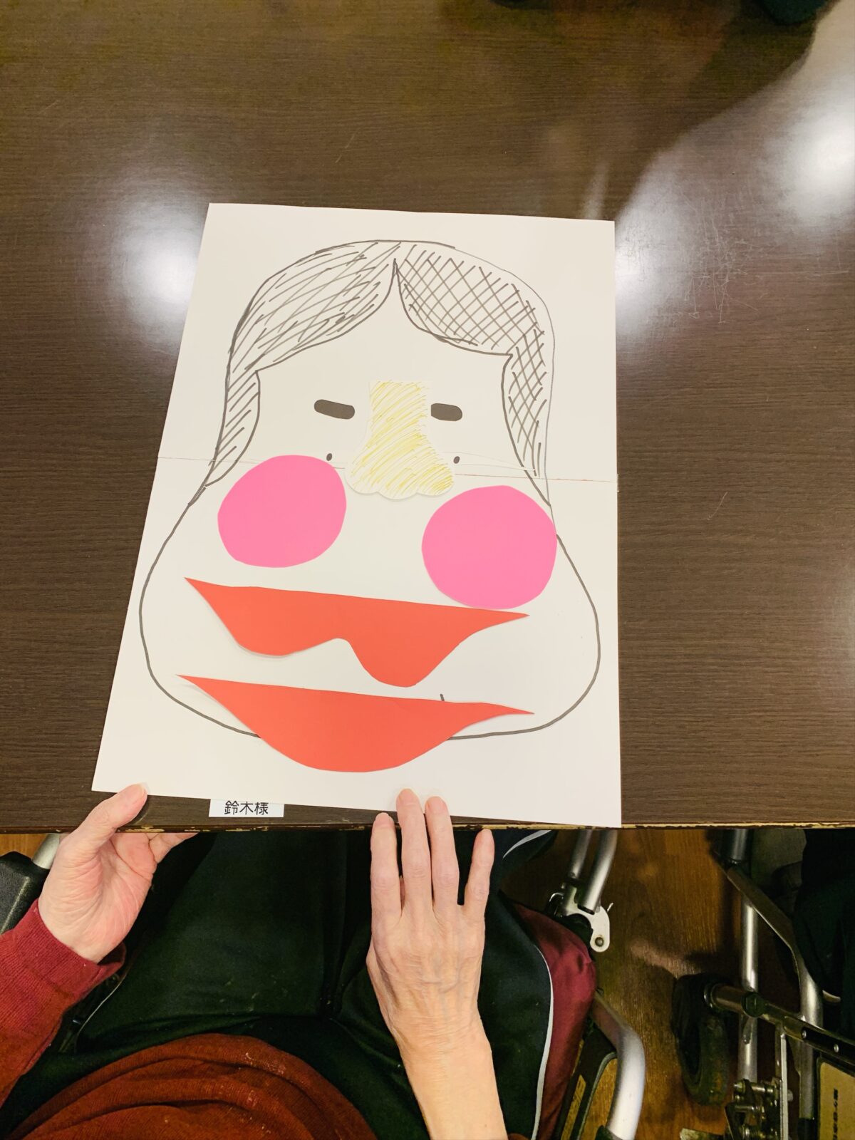 あけましておめでとうございます!新館1階では昼食後に福笑いを行いました。目隠しを外して自分の置いたおかめの顔を見て、皆様大爆笑されておりました(笑)今年もたくさん笑って楽しく過ごして頂けますよう職員一同努めてまいりますので、よろしくお願い致します♪